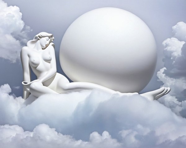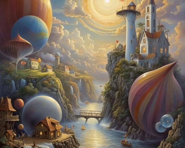 A lone, whimsical castle stands atop a snowy hill, surrounded by giant moons. A wolf watches nearby as a ship navigates the icy waters, creating a surreal, dreamlike winter scene.
