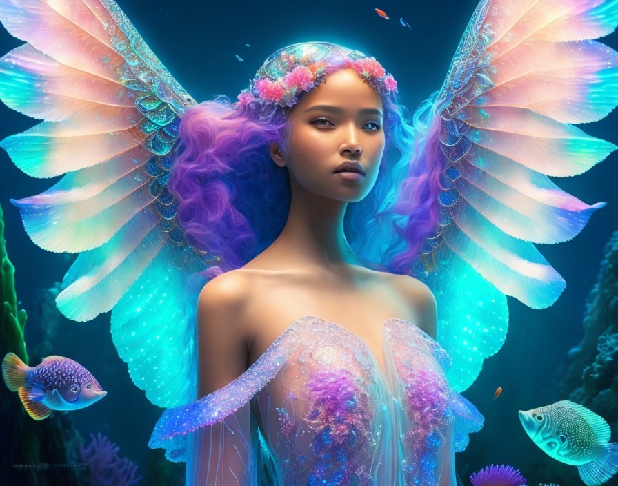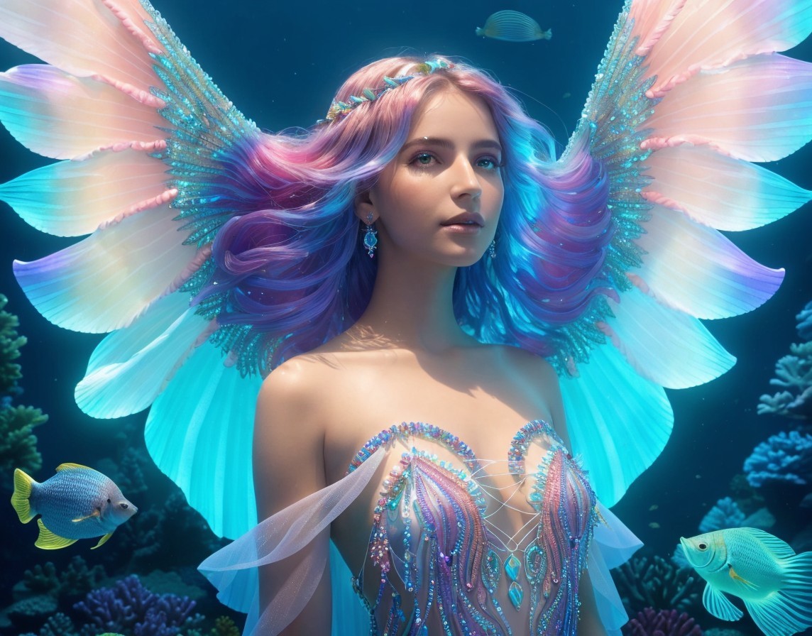 A fantastical image of an angelic woman with iridescent wings and hair, surrounded by vivid fish and coral underwater.