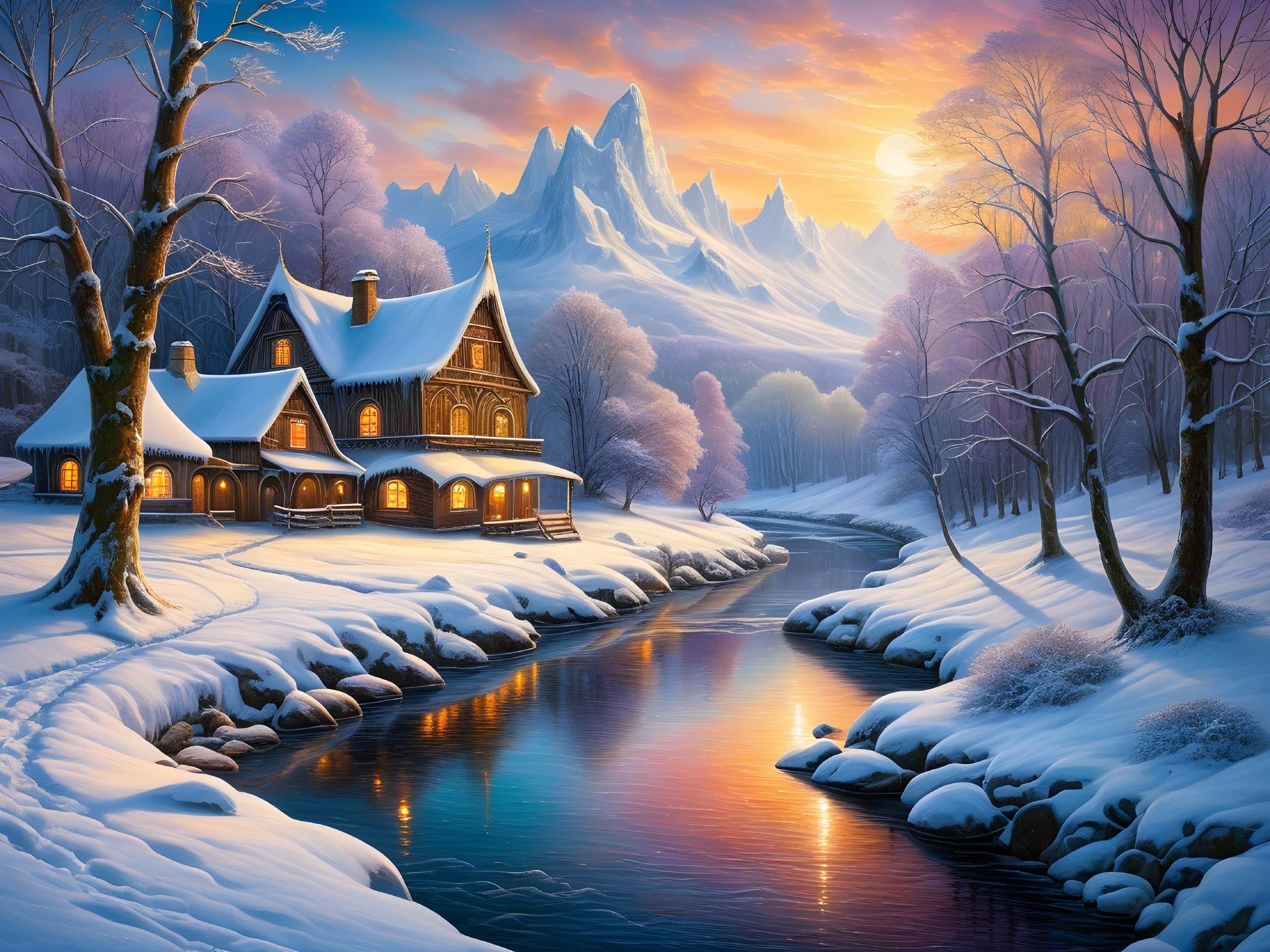 A serene winter landscape features a cozy cottage by a tranquil river, surrounded by snow-covered trees and majestic mountains under a colorful sunset sky. The scene exudes warmth and tranquility.