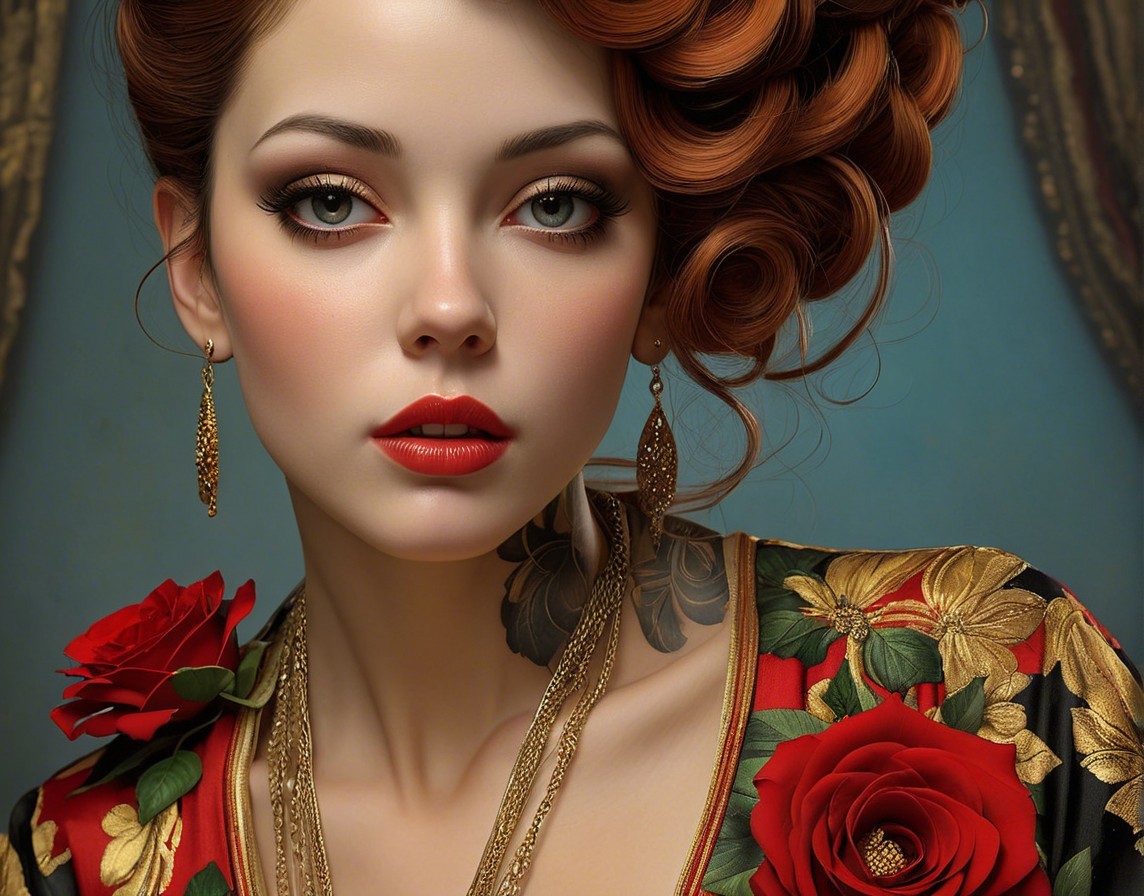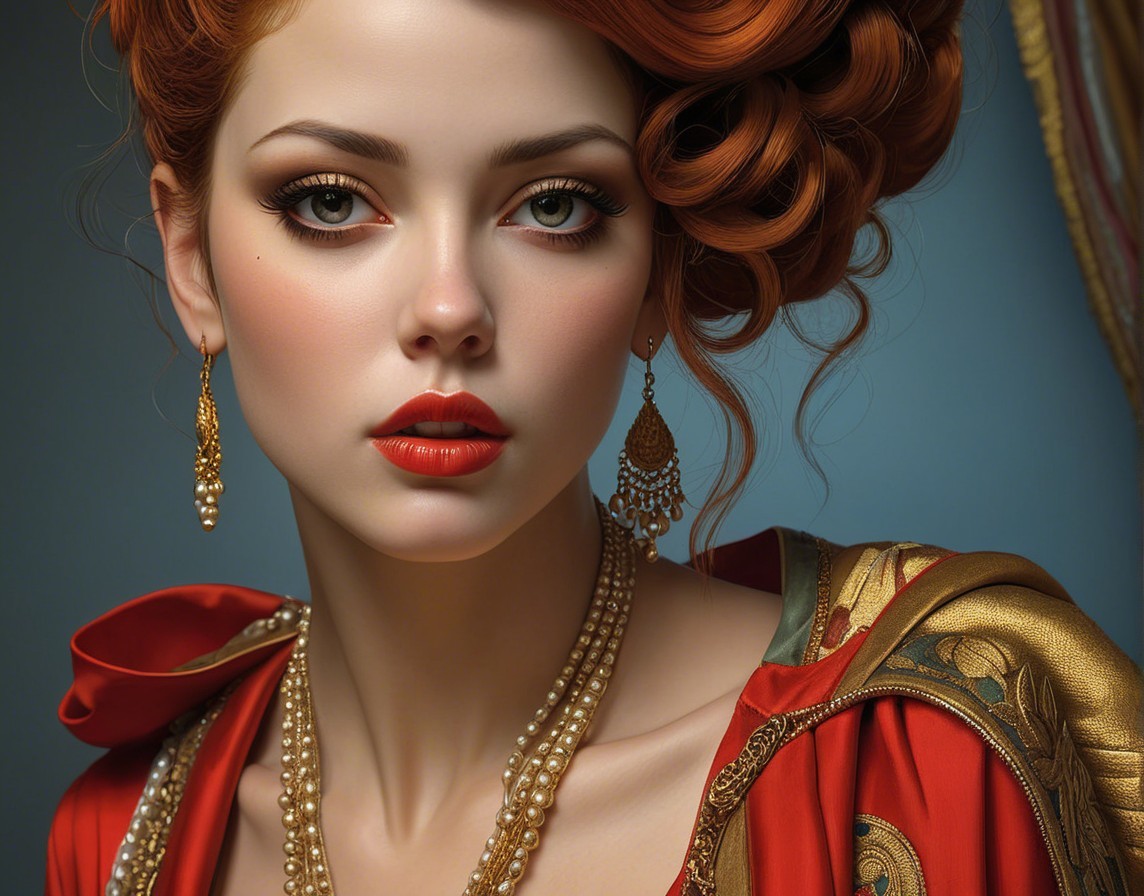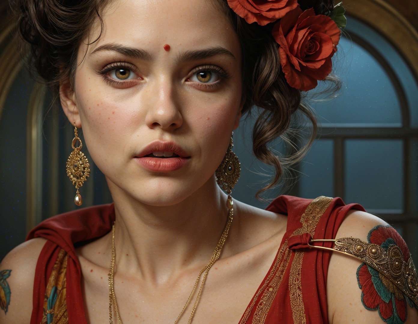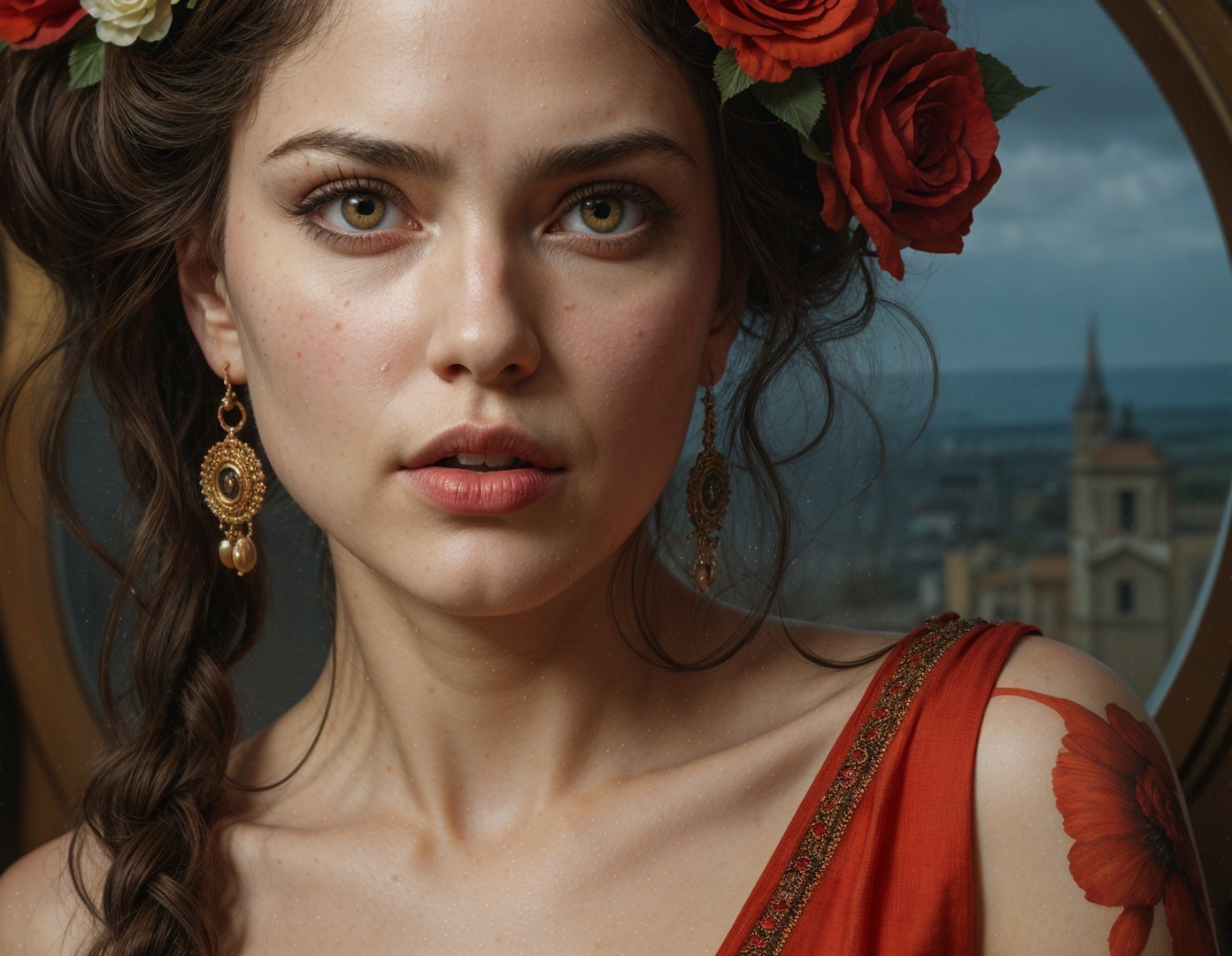 Upon thorough evaluation of the piece, DDG believes it is ,"[a] young woman with long, dark hair adorned with a red rose, wears a striking red dress embellished with gold. She gazes softly, framed by an ornate window and a scenic background."