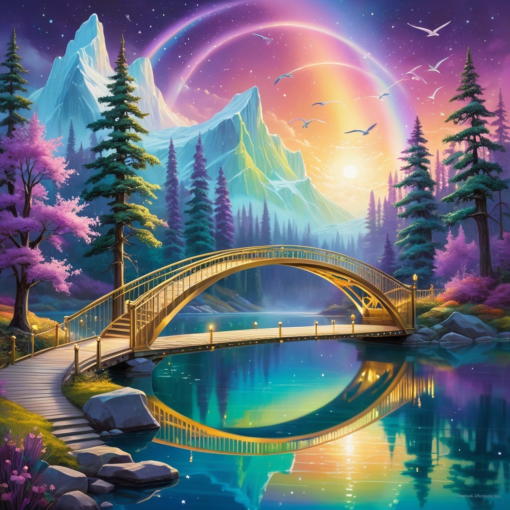 A vibrant landscape features a graceful bridge arching over tranquil waters, surrounded by colorful cherry blossoms, majestic mountains, and traditional pagodas under a radiant rainbow.