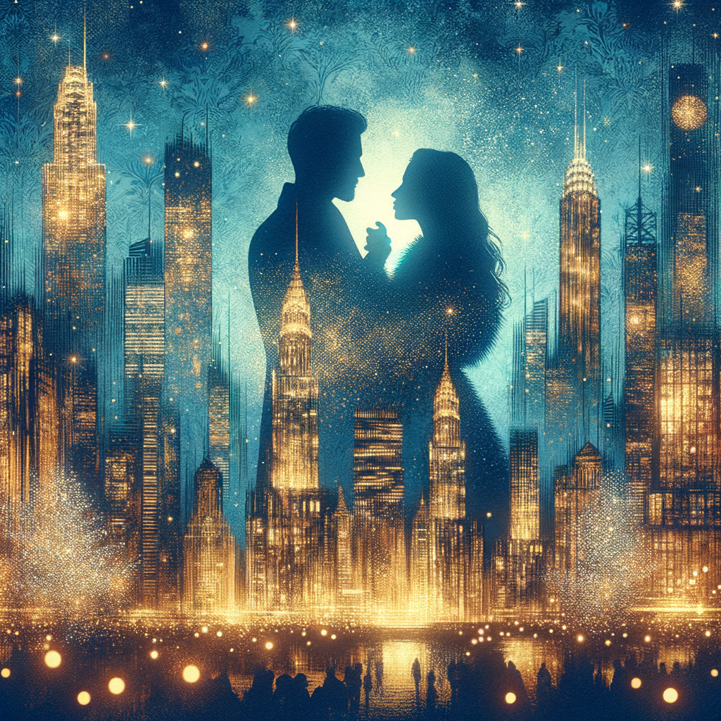 A romantic scene set against a vibrant blue and gold city skyline. A couple gazes into each other's eyes, while another pair holds hands nearby, creating an atmosphere of love and connection.