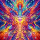A radiant, ethereal figure stands with outstretched arms, surrounded by vibrant, swirling colors and intricate patterns. A luminous light emanates from the head and heart, symbolizing spiritual energy.