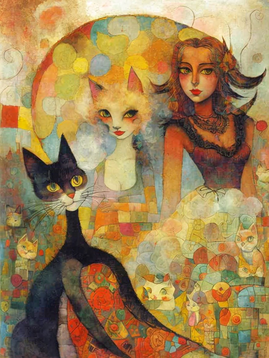 A whimsical painting featuring a stylized woman with a hat and a large, foregrounded black cat, set against a colorful, abstract town.