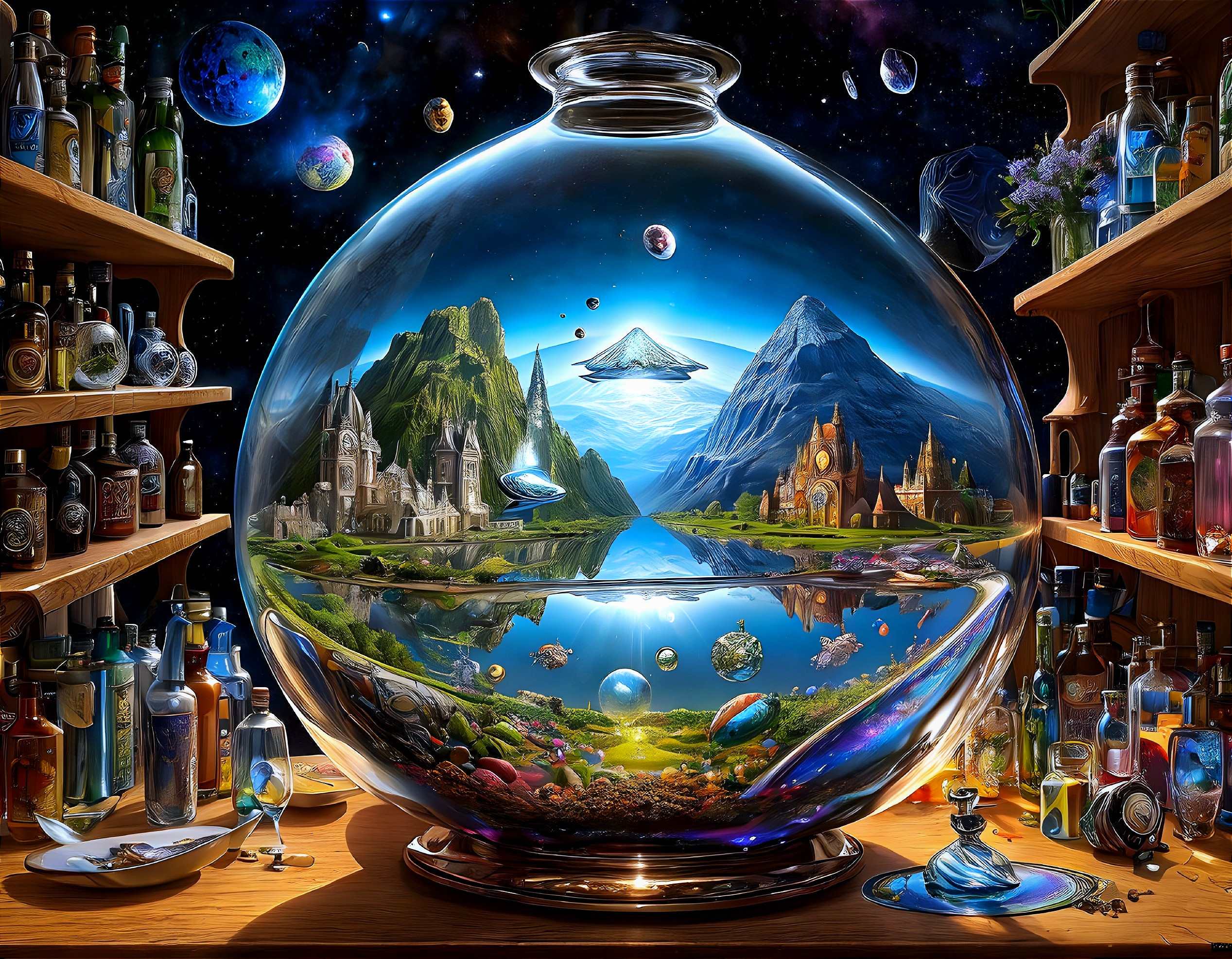 This prompt describes a piece of art that encapsulates a universe within a bottle with intricate details, photorealistic quality, and reflections. It draws inspiration from various renowned artists known for their surreal and hyperrealistic works.
