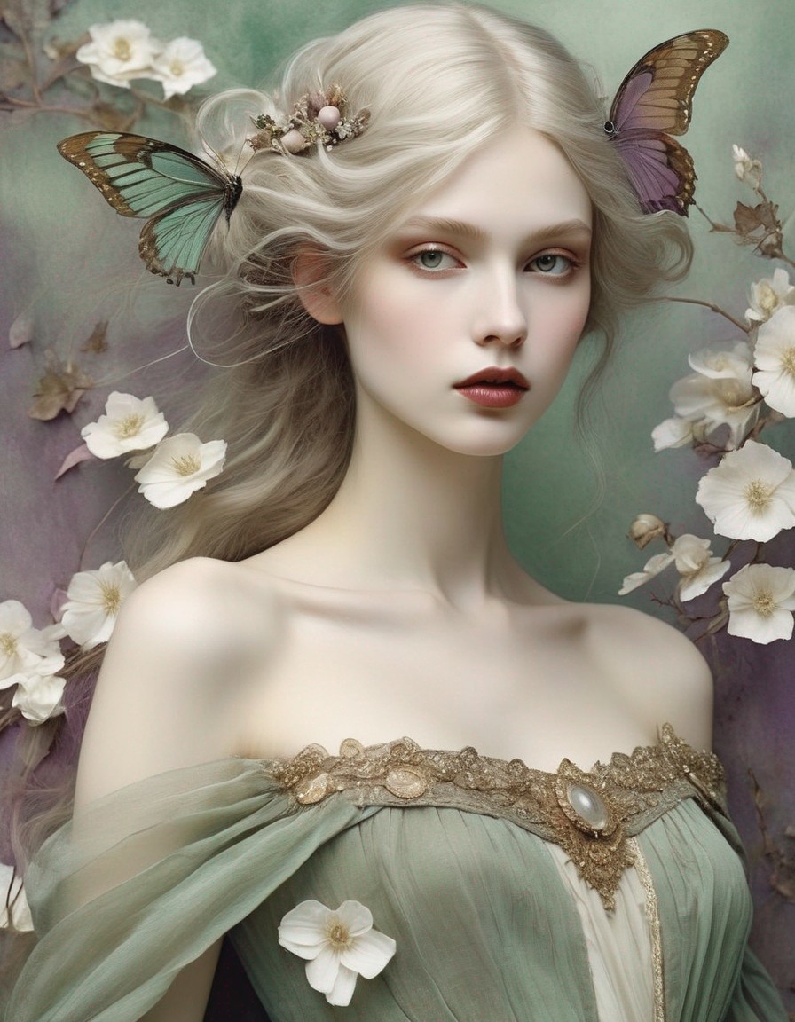 A woman with a floral headdress and vintage dress poses artistically against a moonlit backdrop.
