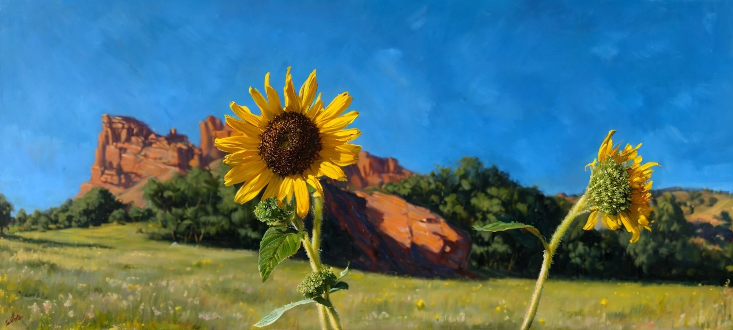 Based on a photo I took on a hike, A painting of two vibrant sunflowers in the foreground with a serene backdrop of a vast field and majestic red rock formations under a blue sky.