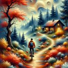 A figure walks down a winding path surrounded by vibrant autumn foliage, leading to a cozy cabin nestled among majestic mountains, under a sky filled with colorful clouds.