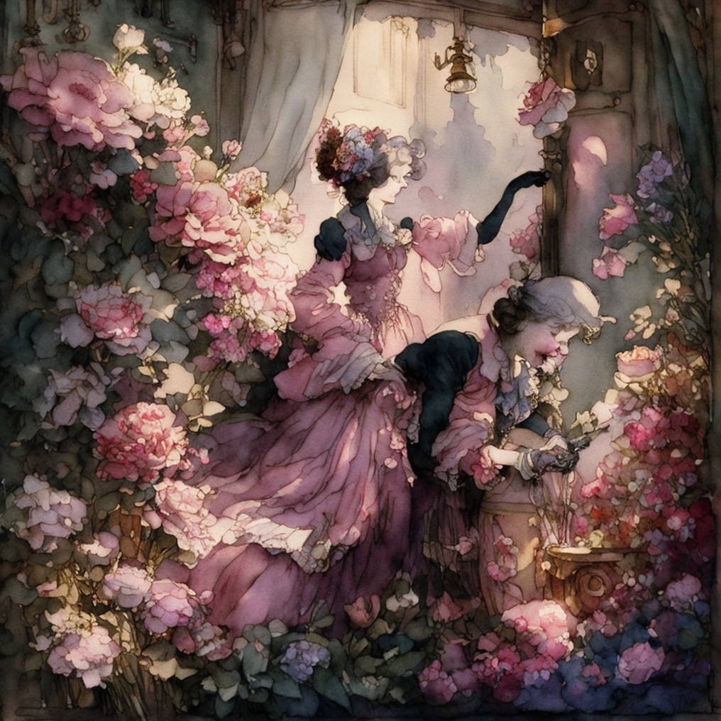 Two cheerful women share a joyful moment in a quaint kitchen, surrounded by vibrant flowers. One holds a large bouquet, while the other arranges flowers on shelves, creating a warm, inviting scene.