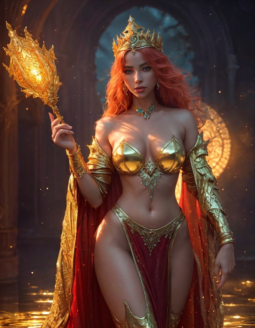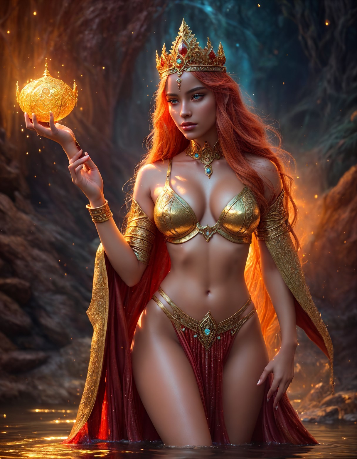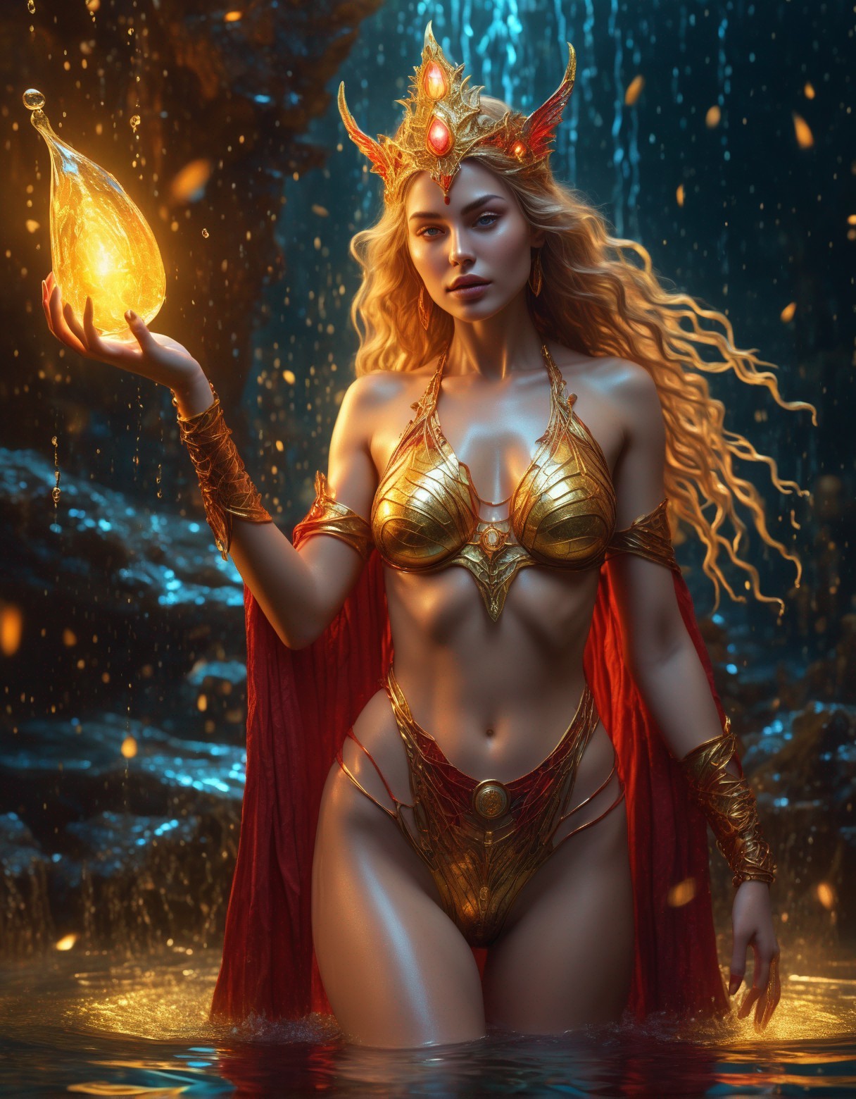 Prompt: A female editorial model as a water godess. Fantasy. Whole body. Head to toe in frame. Magical, magic, mystical, enchanted. Intricate background design. Dramatic. Red lighting. Red, yellow and gold colors. Masterpiece style. Magic in the air.