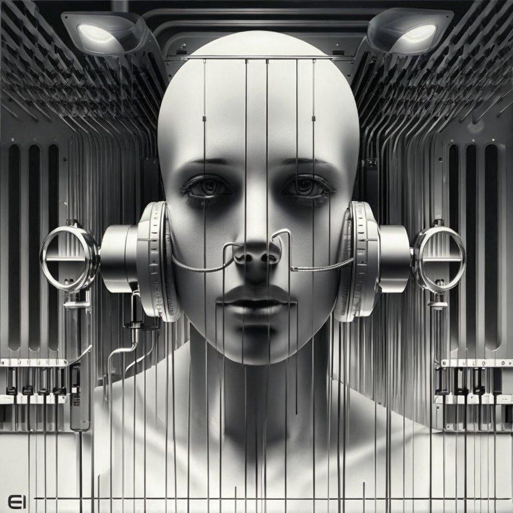 Grayscale symmetrical futuristic female face with headphones in a cybernetic setting