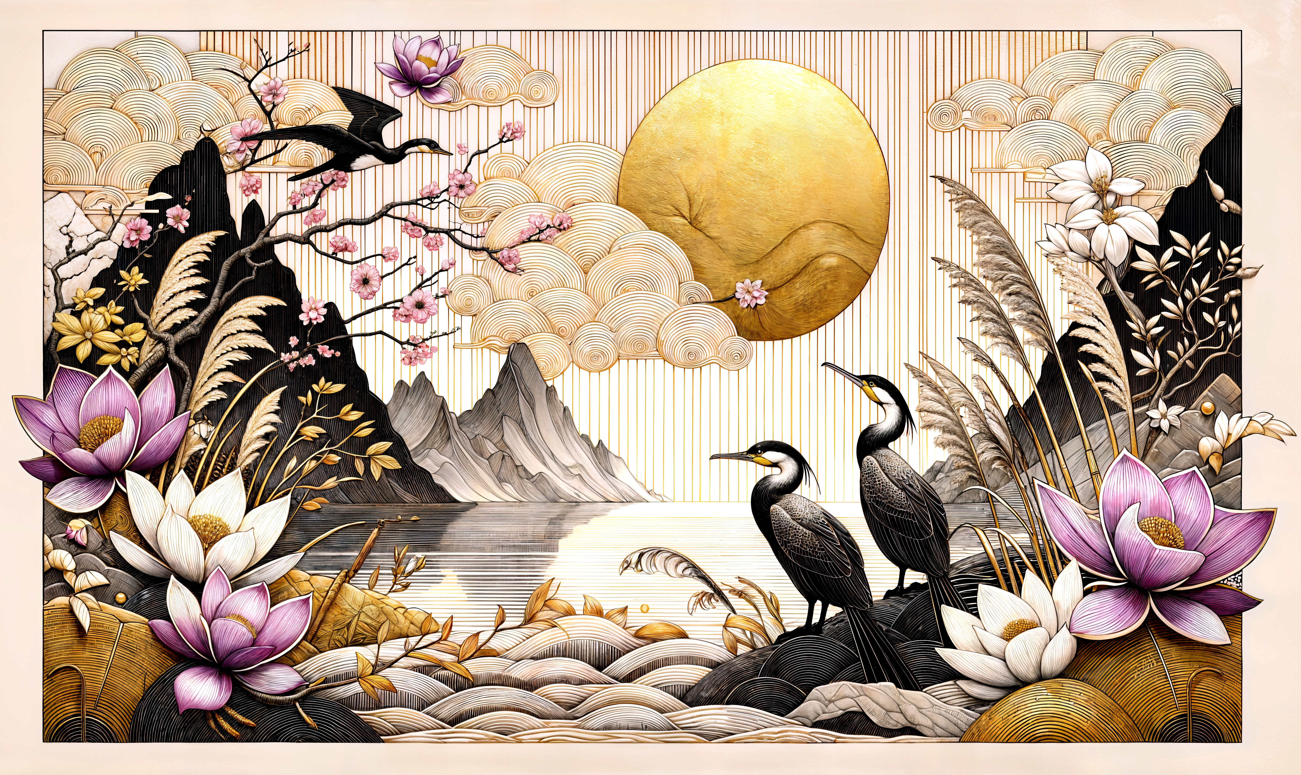 An art piece with a golden moon, cranes, mountains, and lotus flowers in a stylized, symmetrical design with an elegant color palette.