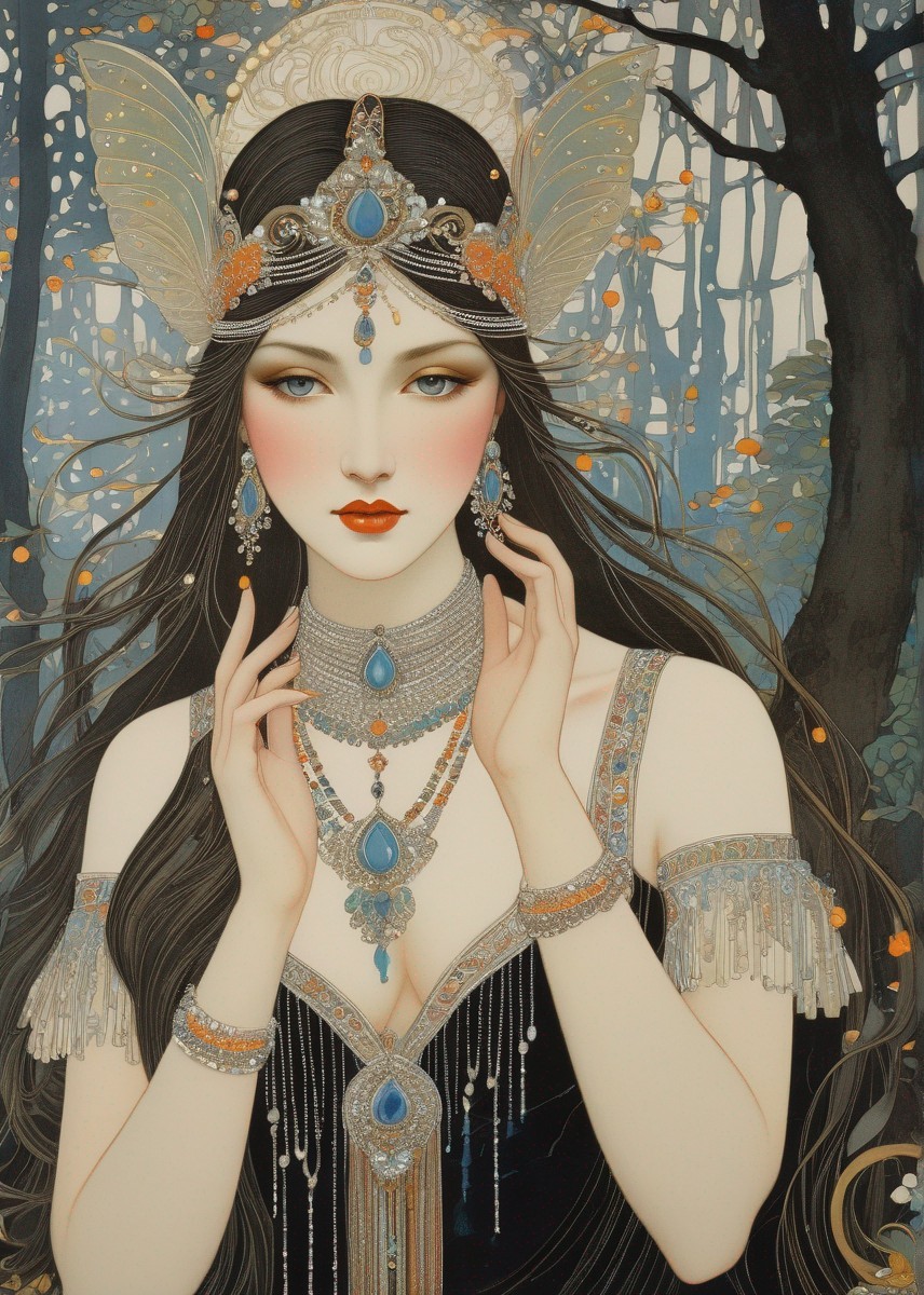 An illustrated woman with jewelry in a stylized forest setting, adorned with ornate accessories and a serene expression.