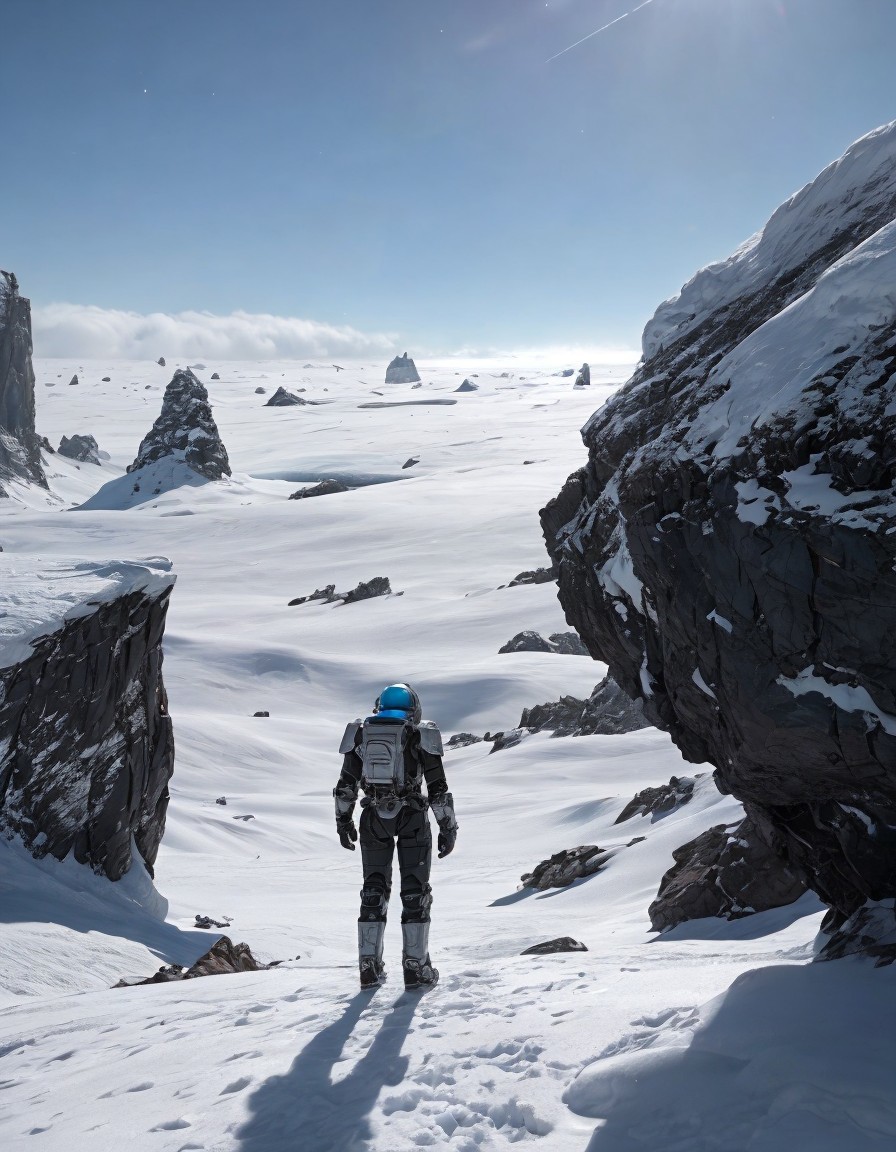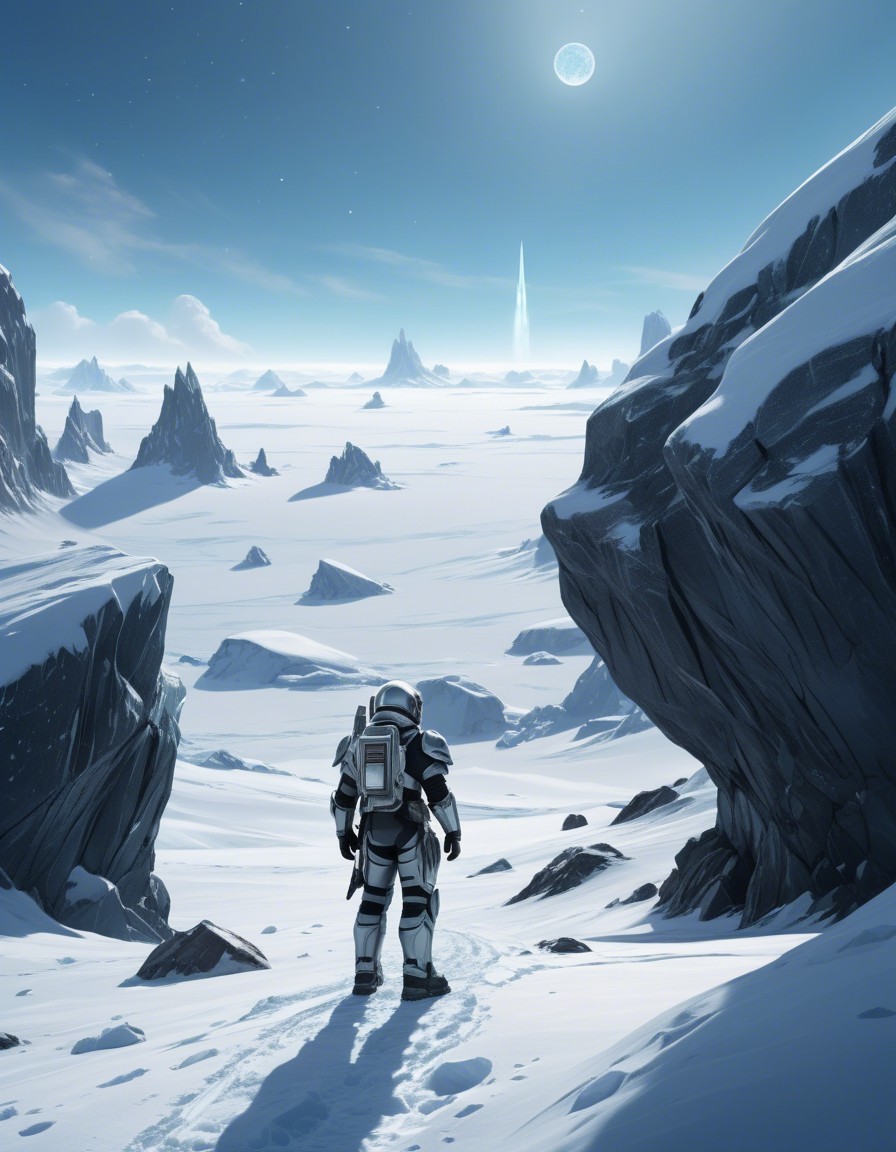 A lone astronaut stands on a snowy, alien landscape, gazing at a futuristic tower illuminated under a bright moon. Jagged mountains rise in the distance, creating a serene, otherworldly atmosphere.