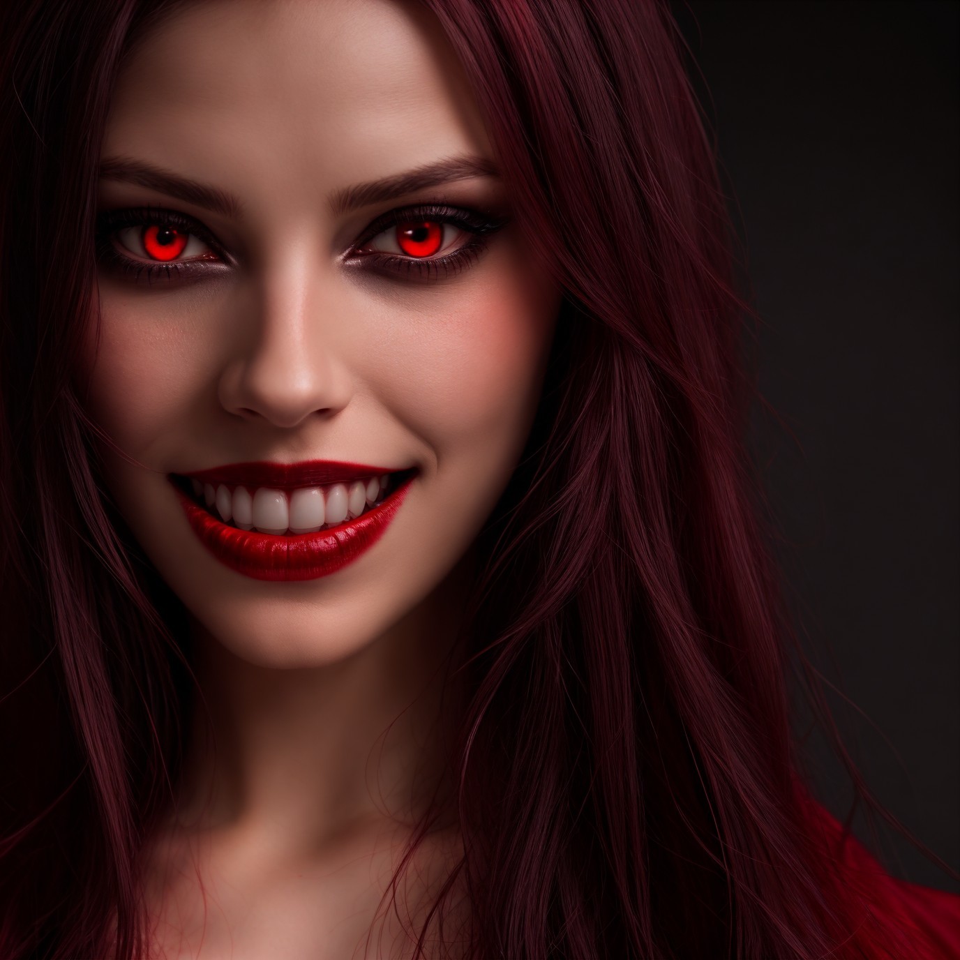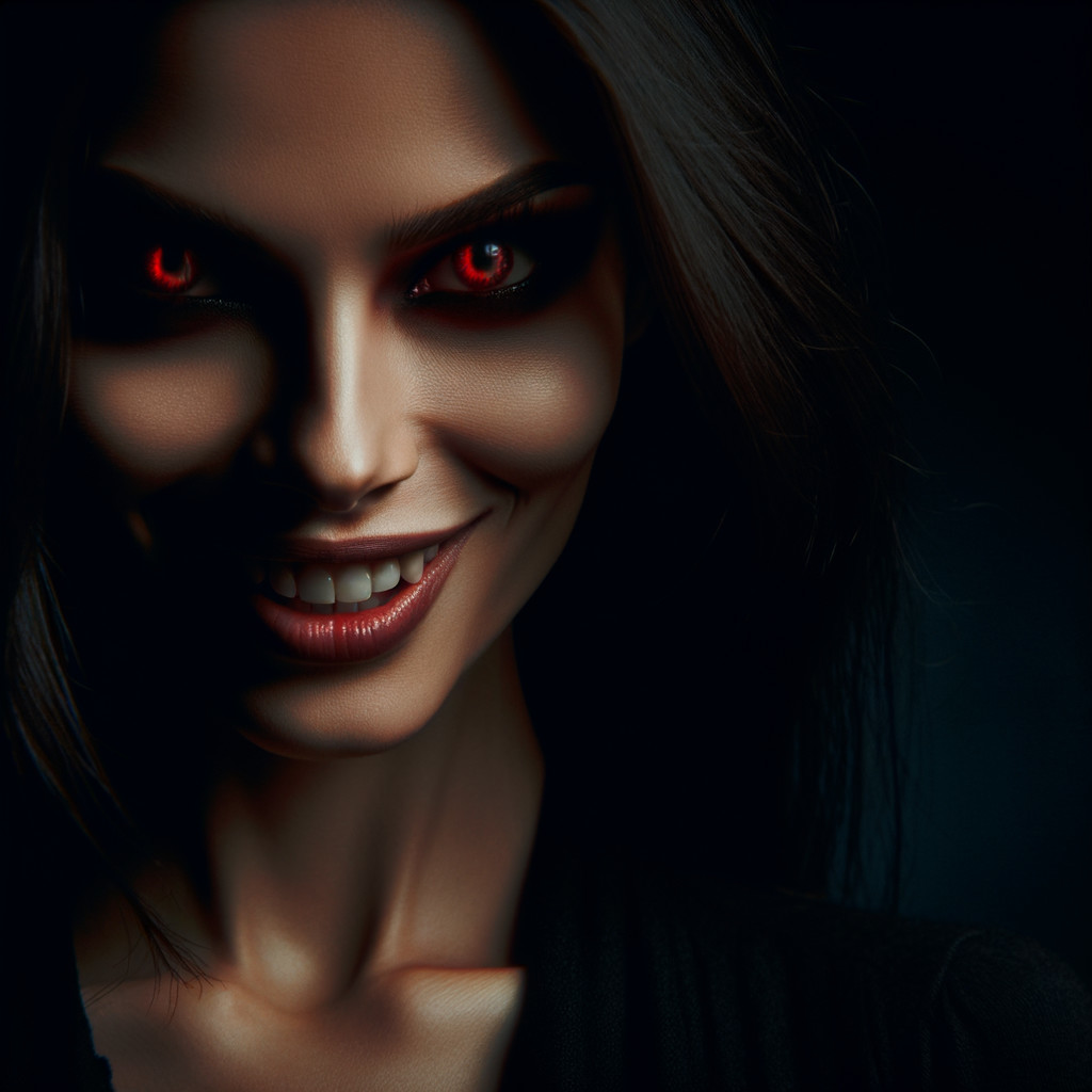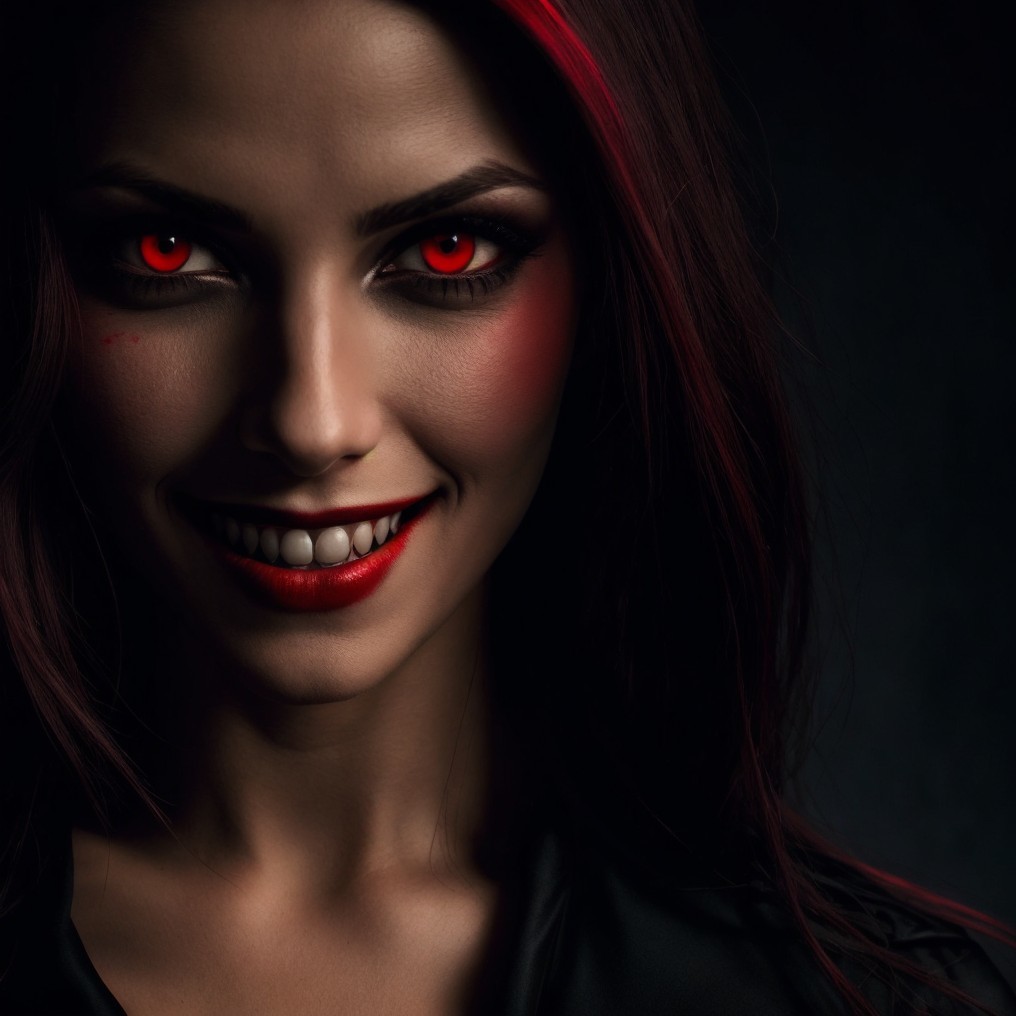 A woman with red eyes and dark hair holding a mask against a red backdrop with shadowy foliage.