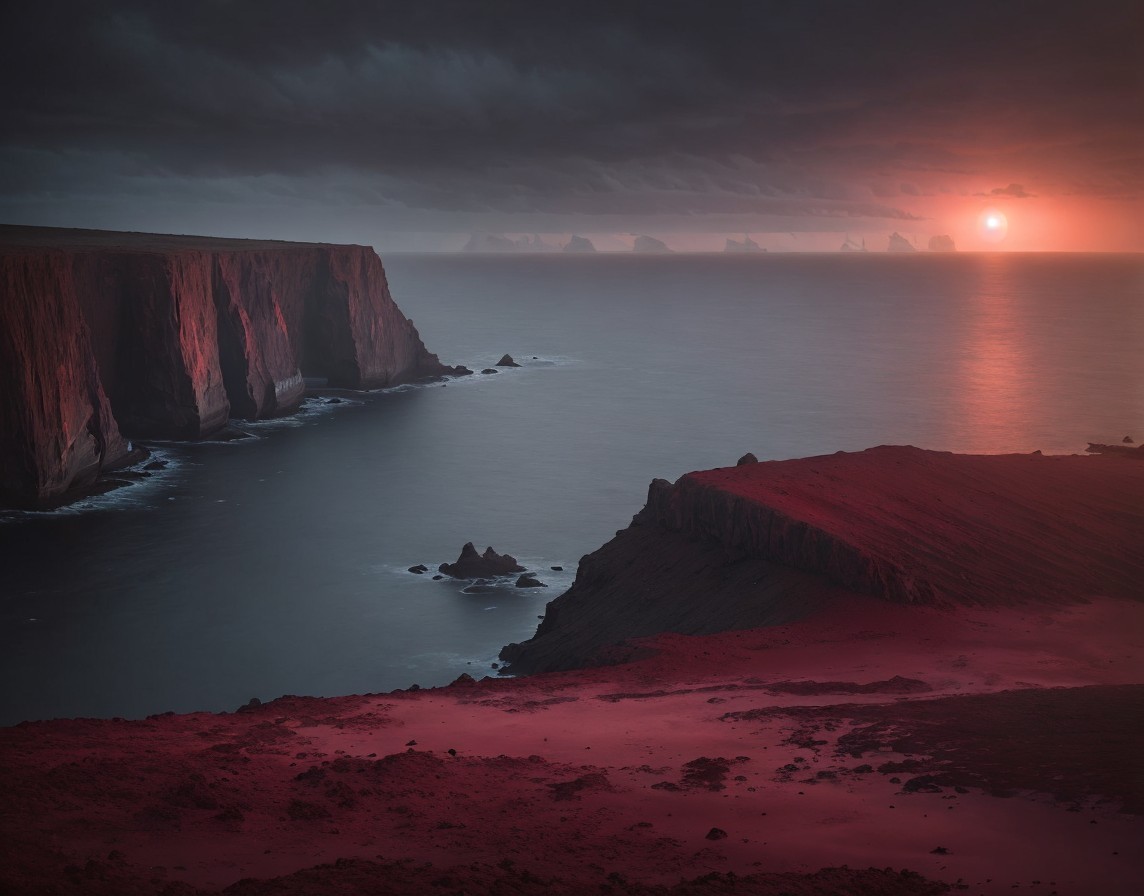 A dramatic coastal sunset with the sun dipping into the sea, illuminating the sky and water in shades of red, flanked by dark, towering cliffs.