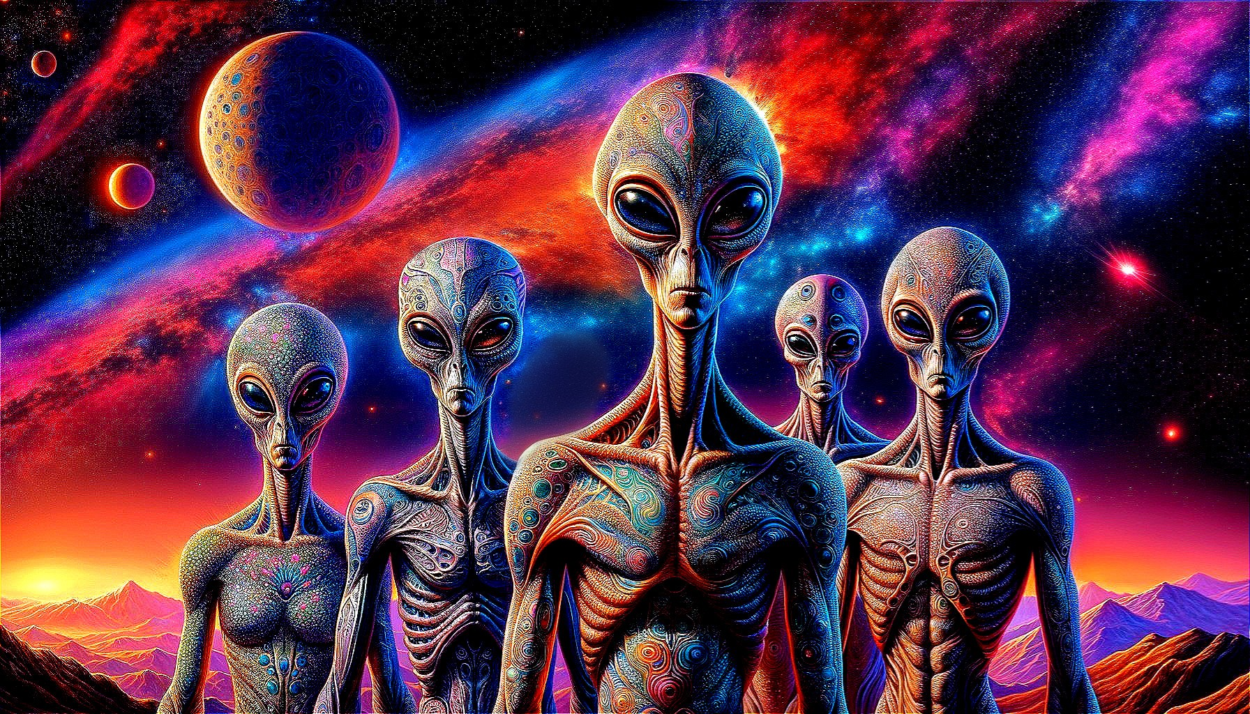 A vividly colored digital artwork featuring Five stylized alien figures with elongated heads and large almond-shaped eyes against a cosmic backdrop.
