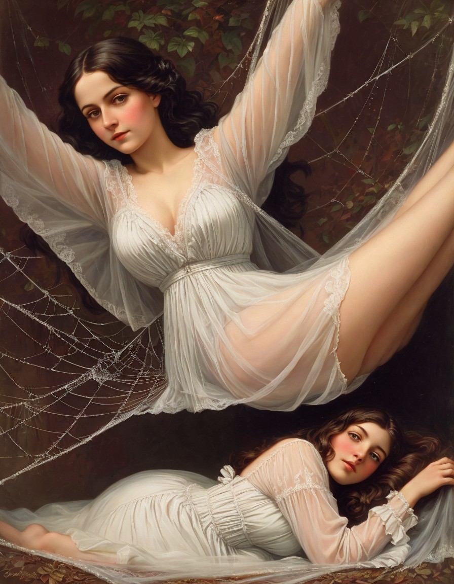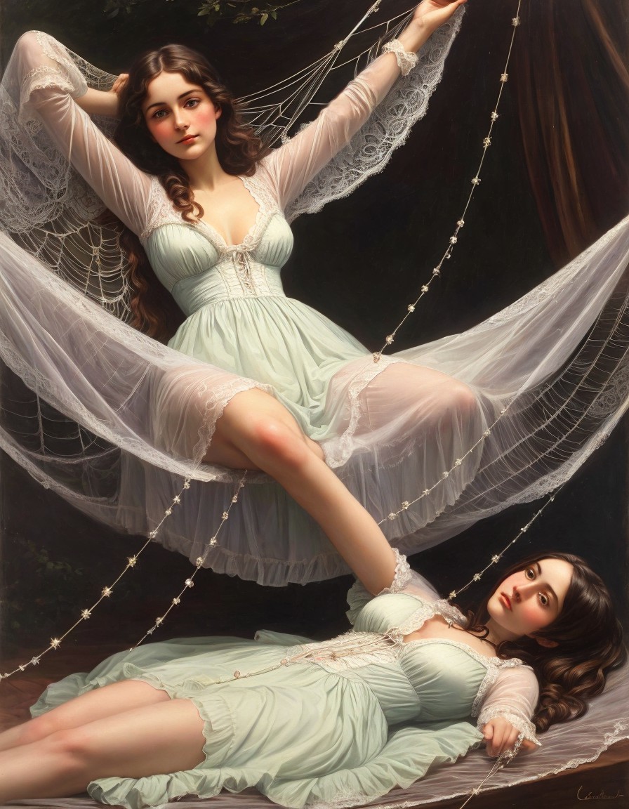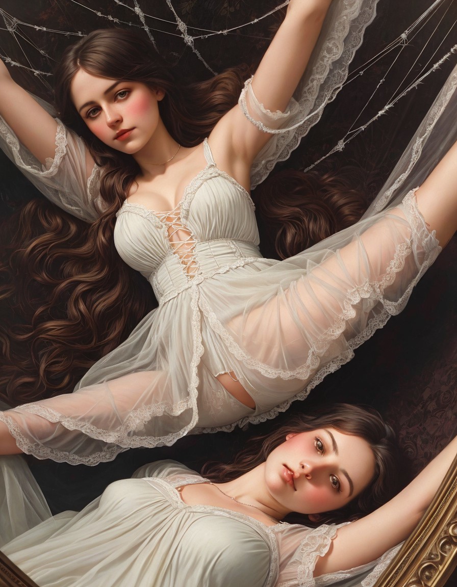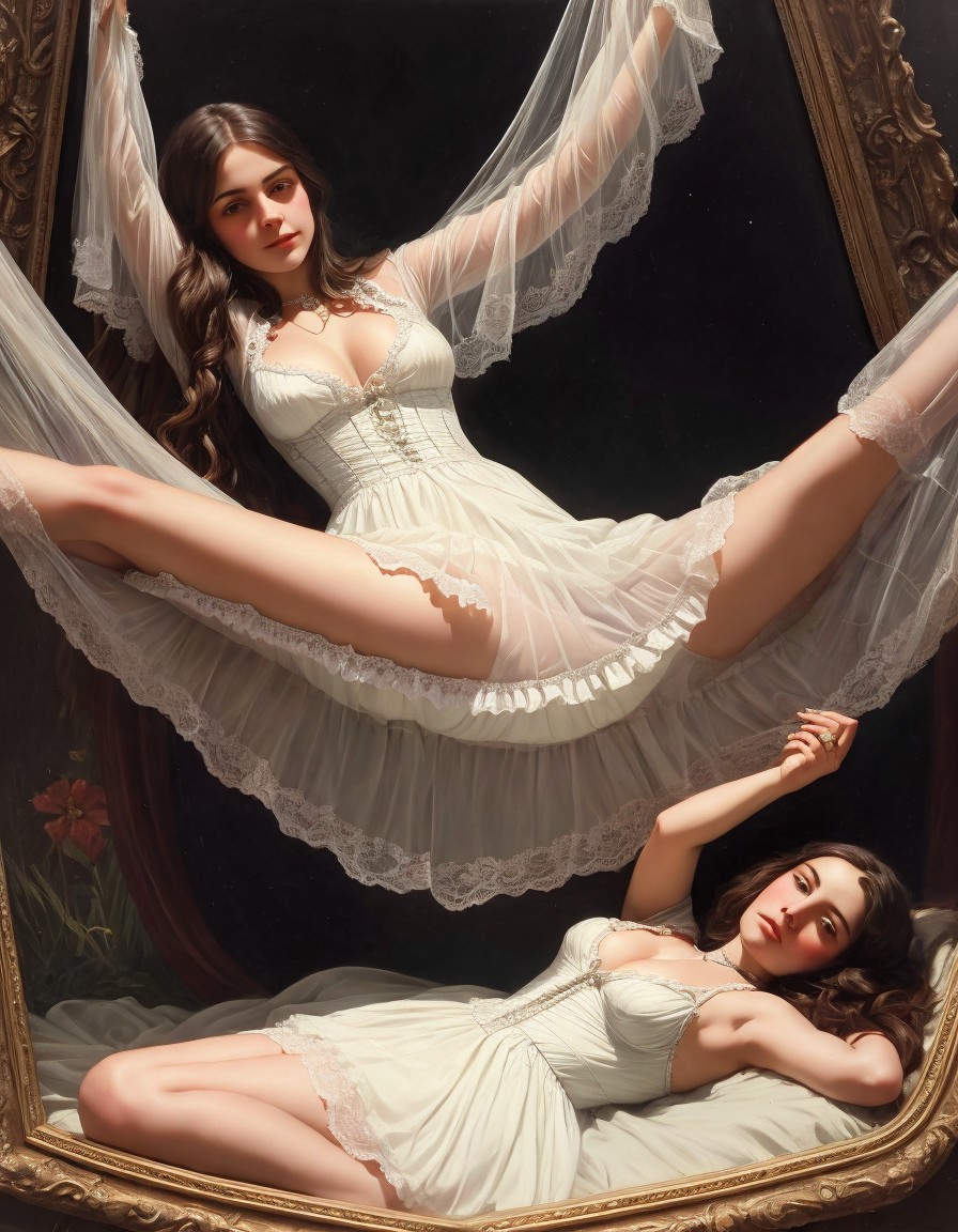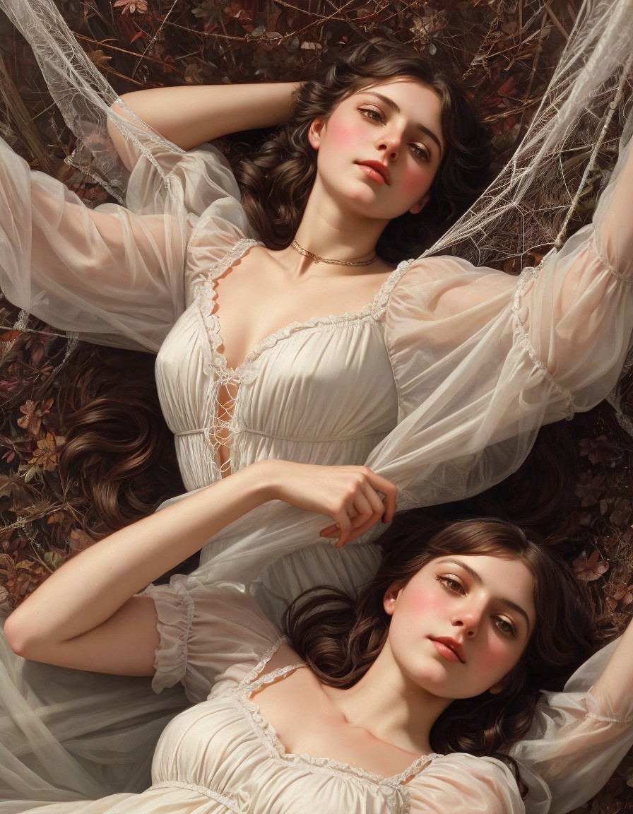 A painting of two women with dark curly hair and white dresses, one looking at the viewer with a reflective expression.