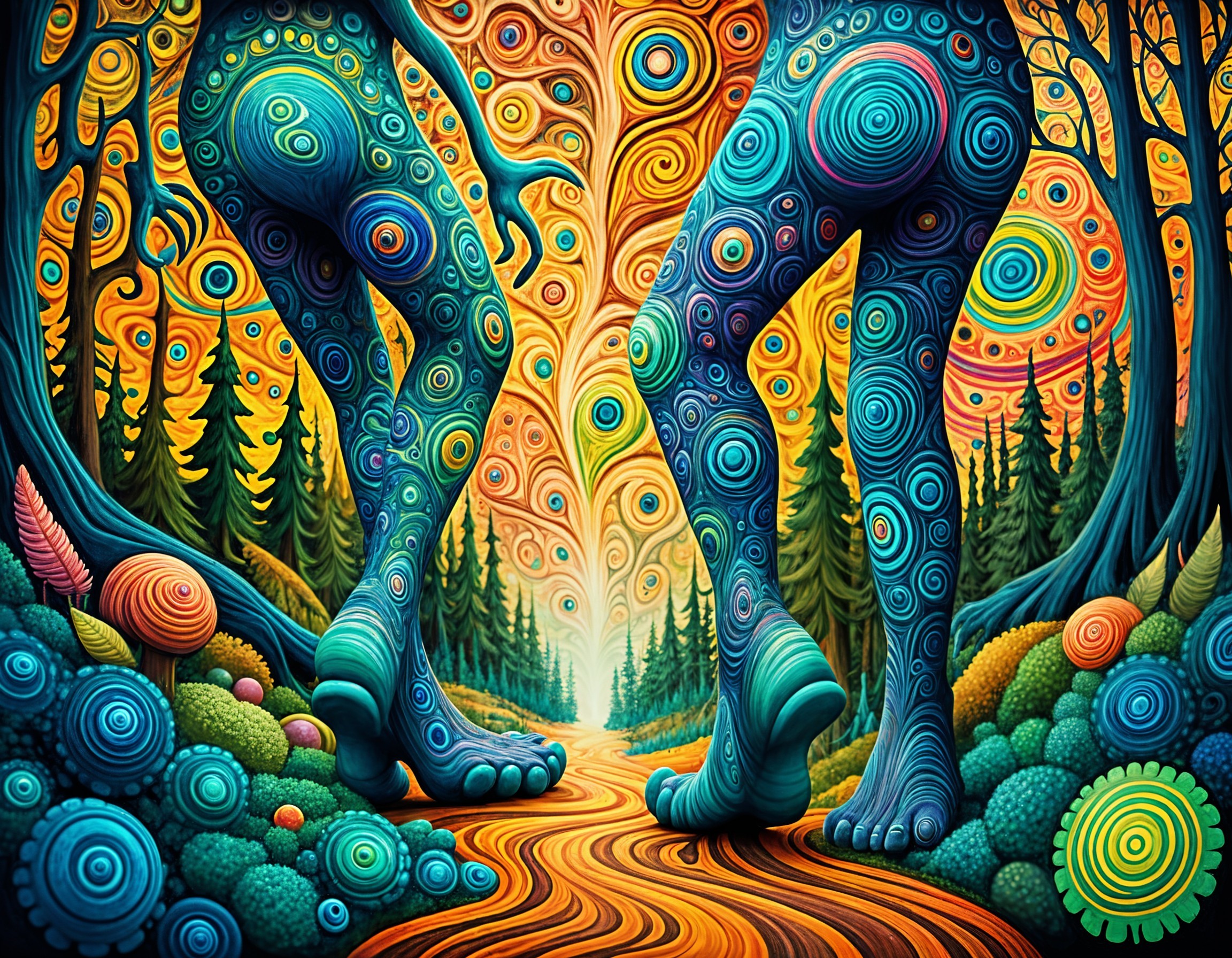 A fantastical creature with a swirling, colorful pattern stands in a vibrant forest, surrounded by towering trees and a winding river. The scene is alive with vivid colors and intricate details.