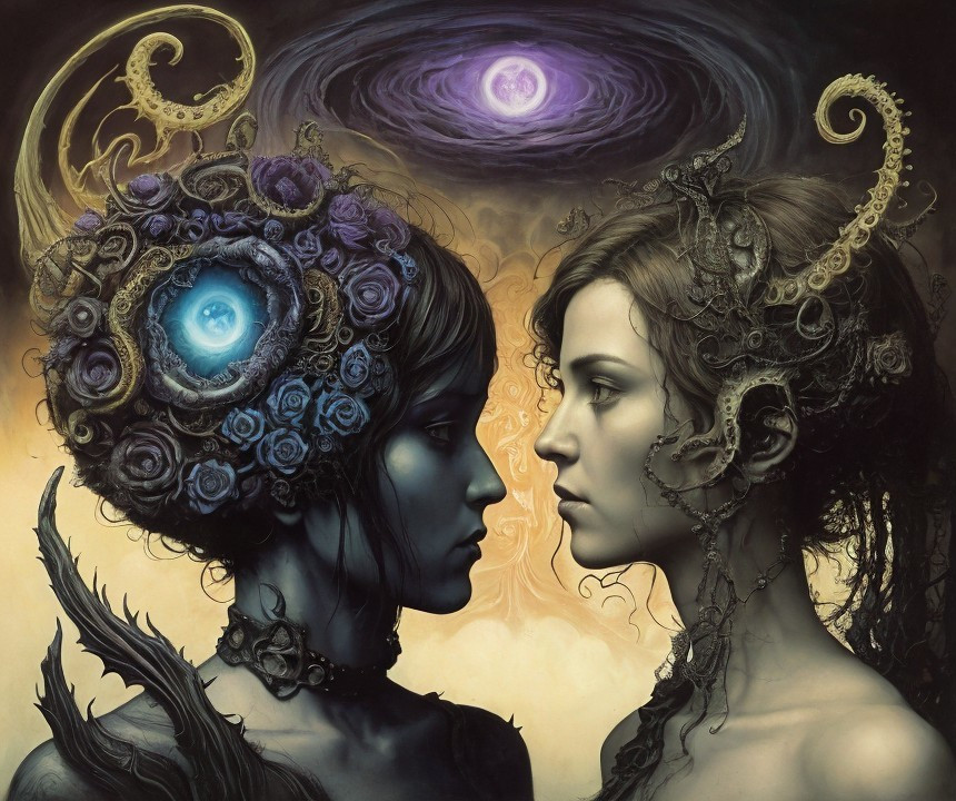 In the style of Felicien Rops, Boris Vallejo, William Blake, ((Zdislaw Beksinski)), Jakub Schikaneder and Jacek Yerka. Ensure all significant elements are fully within the boundaries.