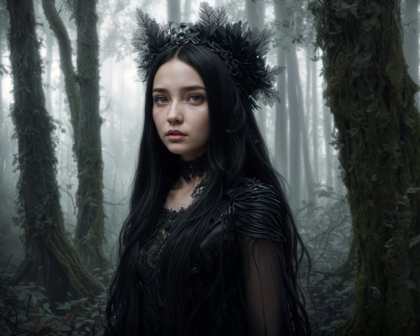 A figure stands confidently in a misty forest, wearing a striking black armor outfit with intricate detailing. The eerie atmosphere is accentuated by twisted trees and a mysterious ambiance.