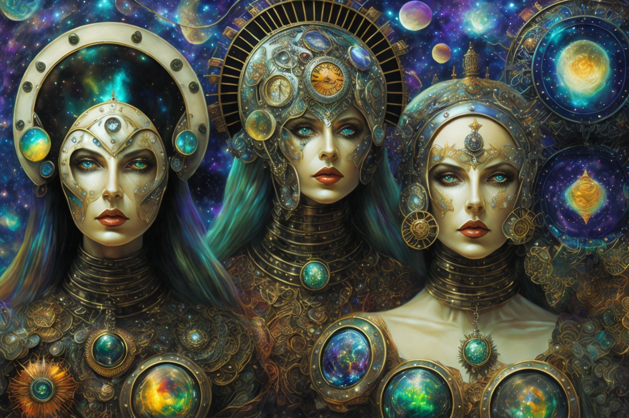 Three futuristic women with ornate headgear and mechanical elements, against a backdrop of gears and glowing circles.