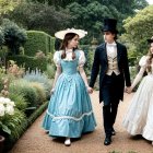 In a vibrant garden, a man in a top hat and two young women in period dresses stroll hand in hand, surrounded by blooming flowers. A large, whimsical bunny character follows behind them.