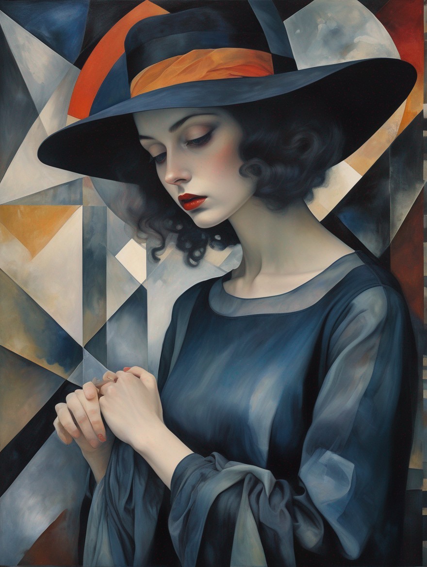 A painting of a woman with pale skin and red lips wearing a hat, with smoke swirling around her against a blue backdrop.