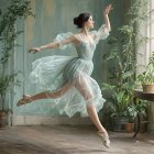 A graceful female dancer is captured in mid-leap, with her body angled towards the right side of the frame as if in motion. She dons a flowing mint-green dress with a lace bodice, puffed sleeves, and a pleated skirt that billows around her legs, revealing her white high-he