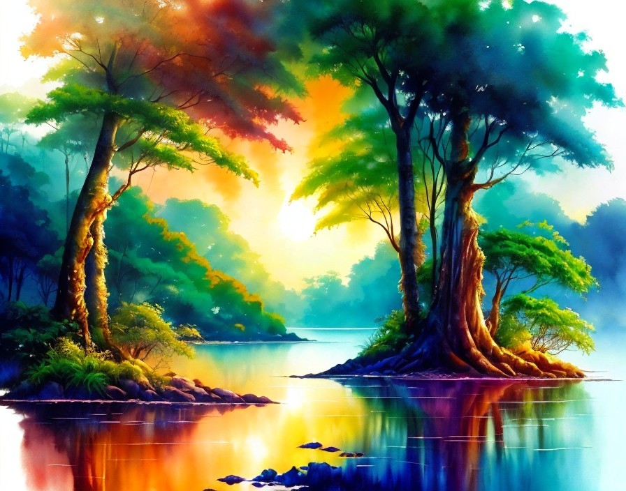 Prompt: "3D watercolor technique, full-page composition, no frame or border, fantastic wide view, spectacular sunrise over a beautiful Rainforest jungle river, satiny, high quality, shimmering, elegant and vibrant color palette, soft watercolor textures, rich hues of gold, teal, and blue, dreamlike atmosphere, shimmering reflections, satiny finish, magical and sophisticated style, by Alphonse Mucha, with elements in the style of Gustav Klimt and elements in the style of Jan Toorop."