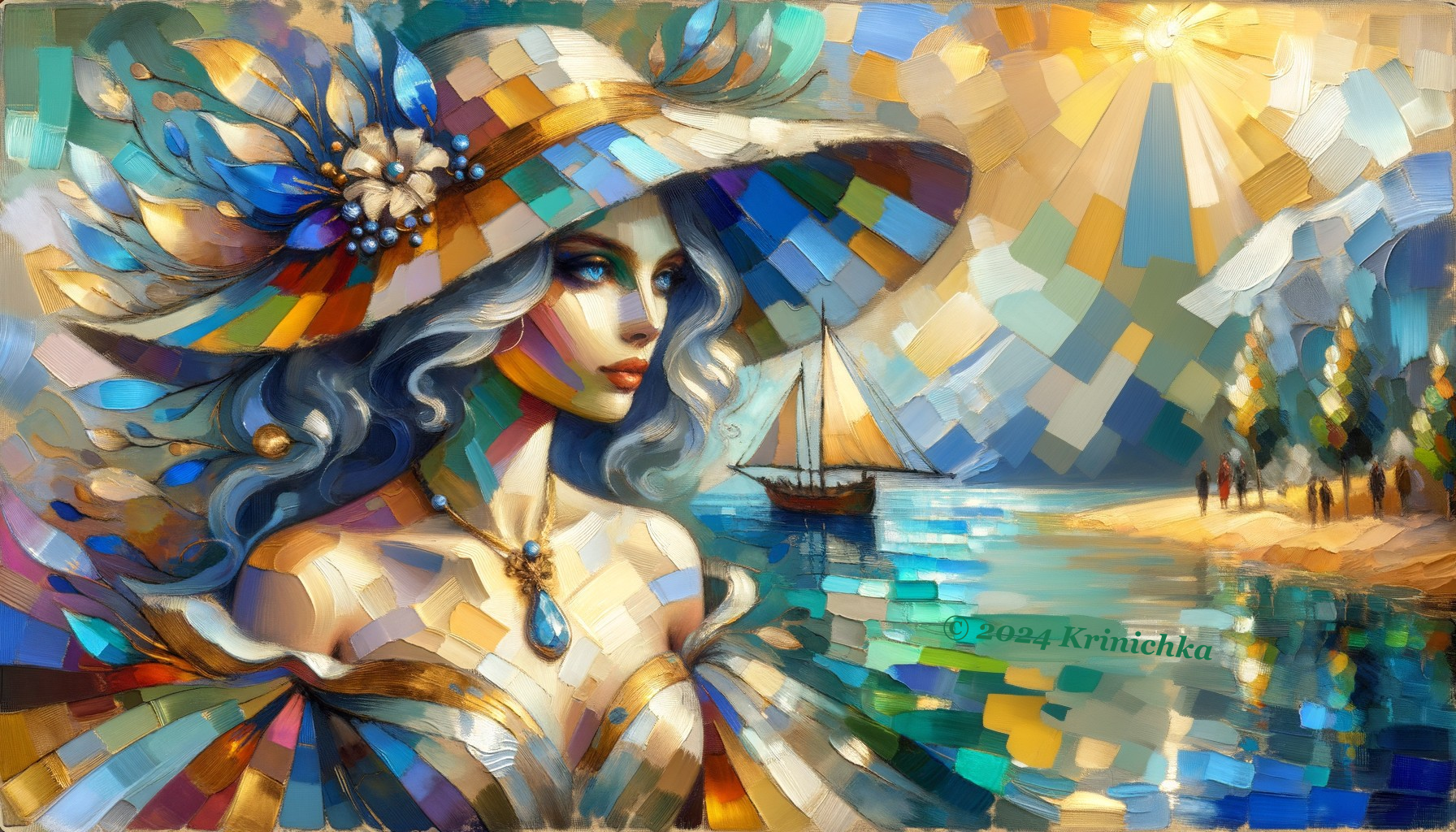 A vibrant artwork featuring a woman with a stylish hat, set against a mosaic backdrop with a sailboat and trees.
