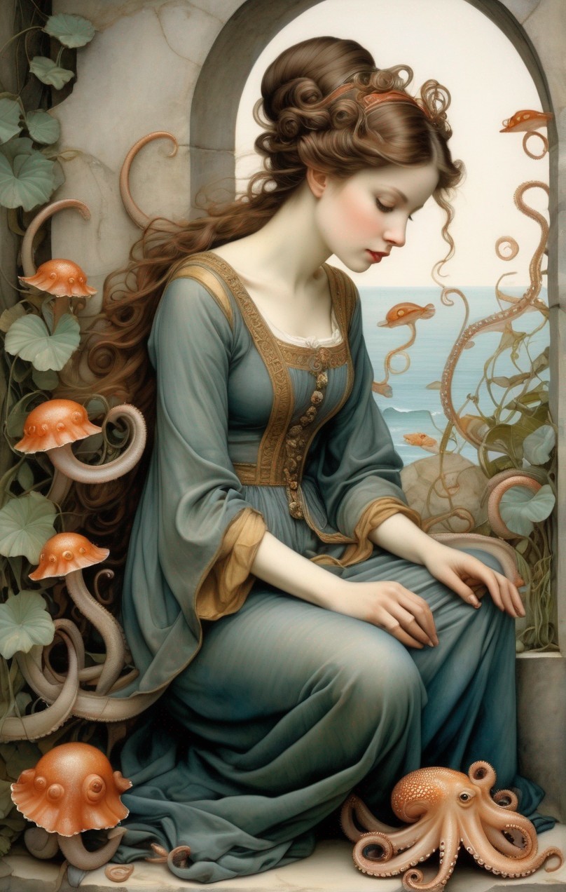 A woman in a blue dress sits by a stone window, with octopuses around her, overlooking a seascape with boats.