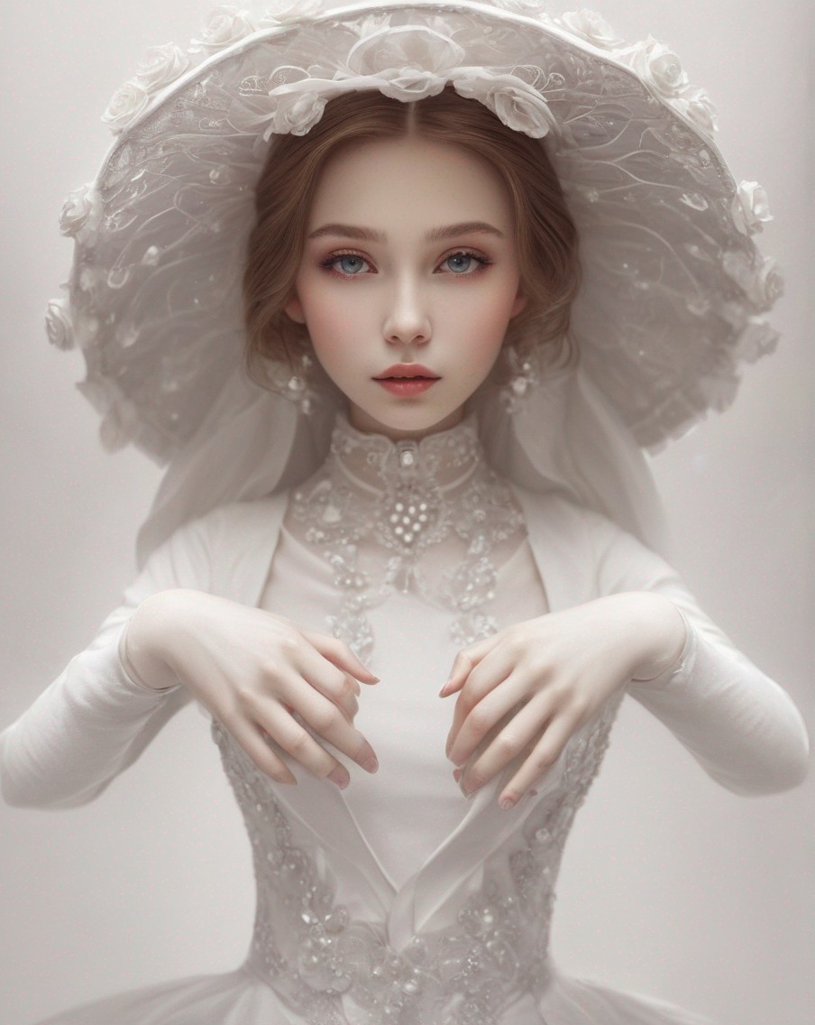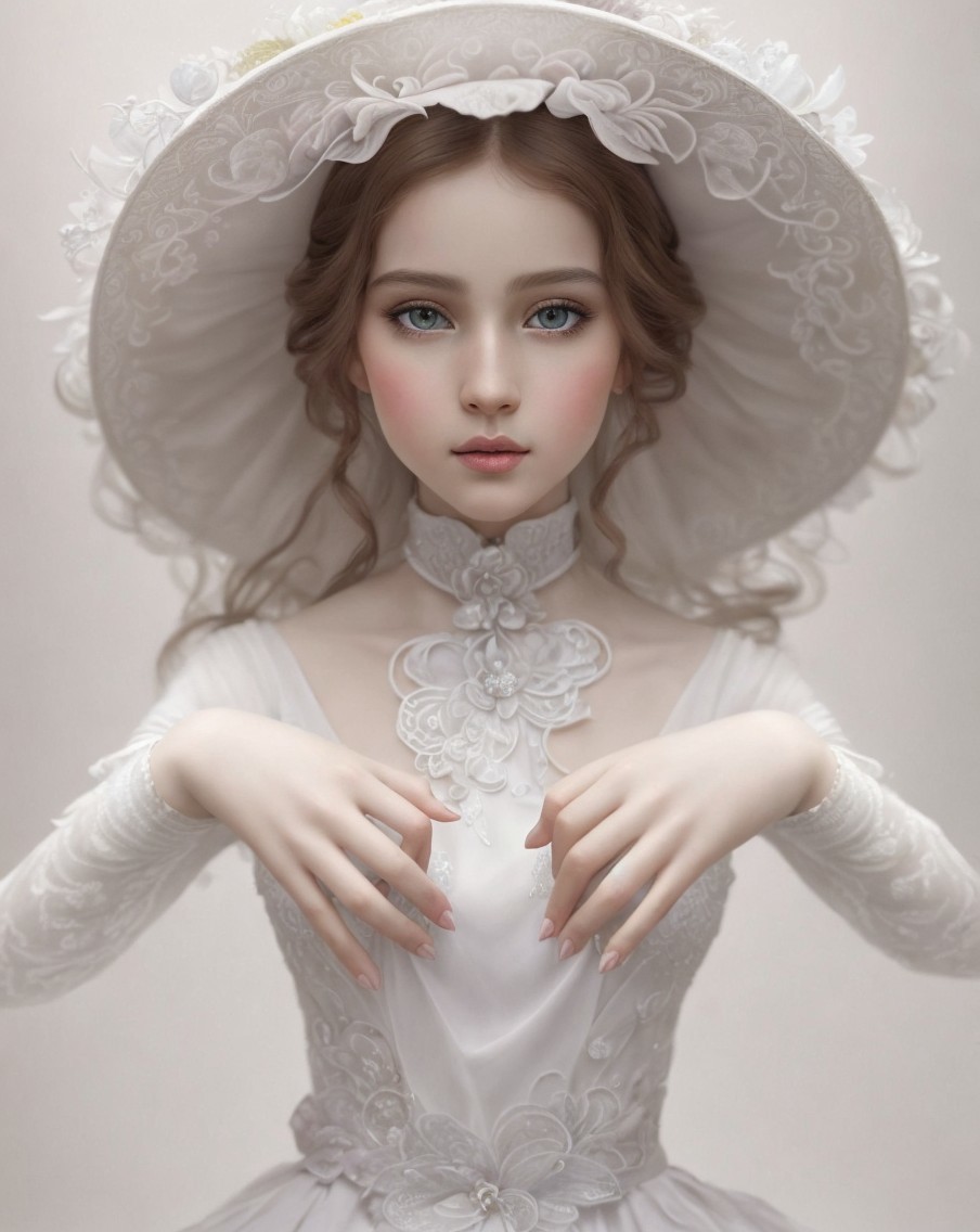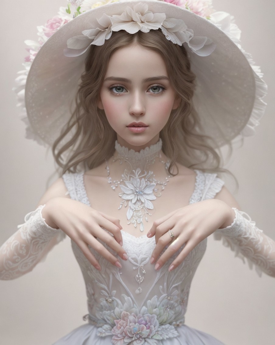 A young woman with a delicate expression wears a wide-brimmed hat and a pale dress. Her hands are positioned gently, and her face features artistic splashes of color, creating a dreamy atmosphere.