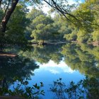 A highly detailed, wide shot of an autumn landscape featuring a pond reflecting colourful trees and a bright sunny sky. The pond is surrounded by a dense forest of trees with vibrant red, orange, and yellow foliage. The sunlight streams through the canopy from the right, casting a warm glow on the scene.