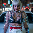 A stylish character with curly blonde hair wears a sleek, futuristic outfit featuring metallic accents. She poses confidently on the hood of a car against a vibrant urban backdrop.