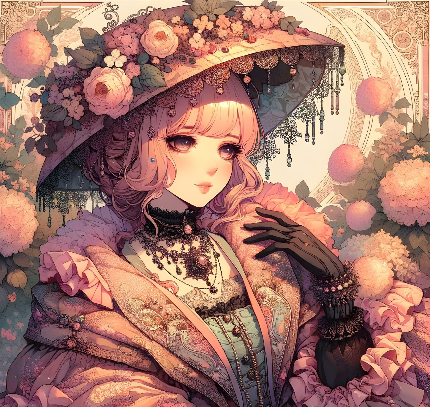 A elegantly dressed girl wears a floral hat and adorned gown, surrounded by soft pastel blooms. Her contemplative gaze and intricate jewelry exude a romantic, vintage charm.