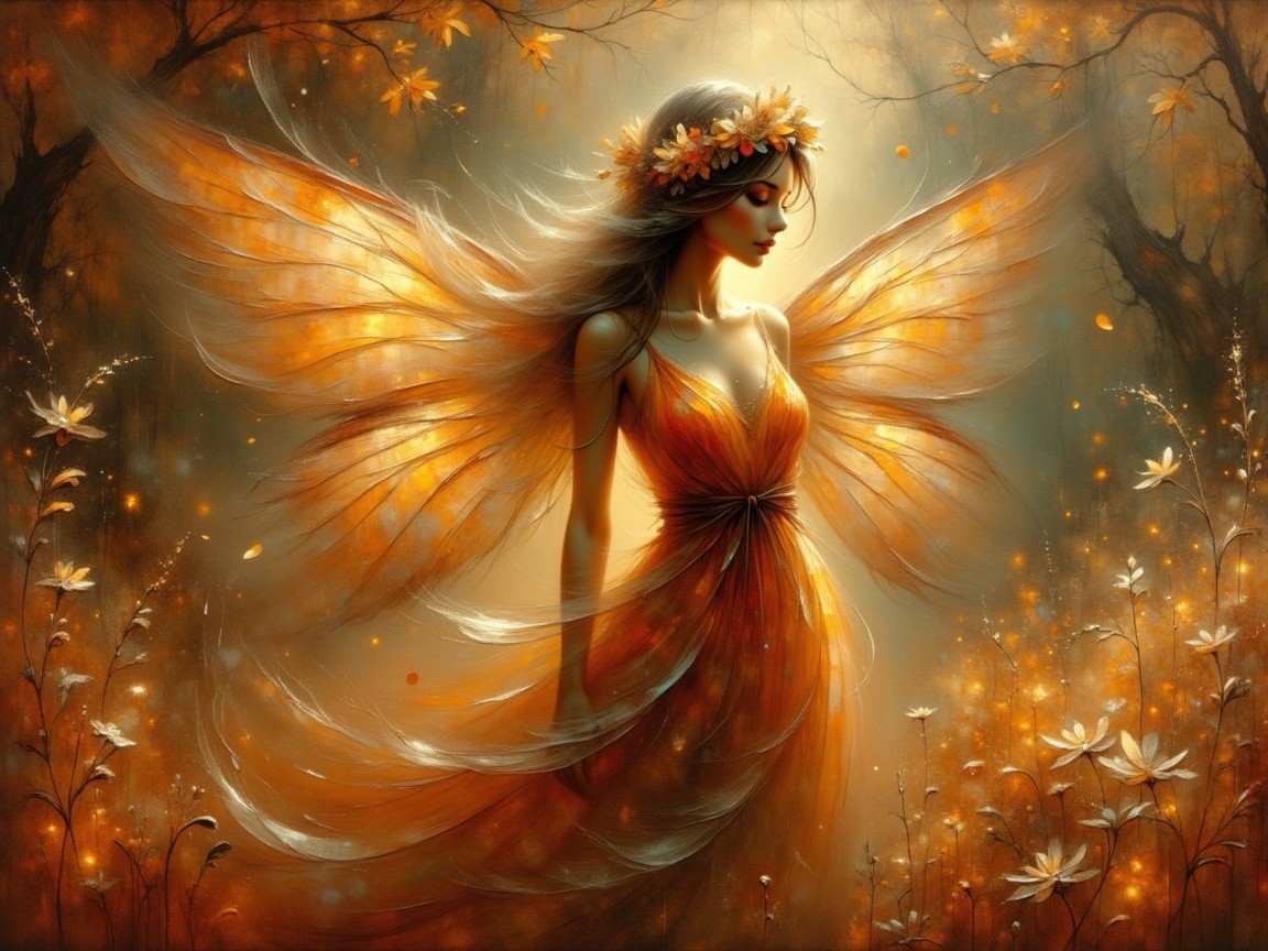 it is the most beautiful, winged, wonderful, capricious and tender, with beautiful and transparent wings in the foreground the stupendous beauty with behind a magnificent autumn landscape with many small magical and hopeful sparkling lights