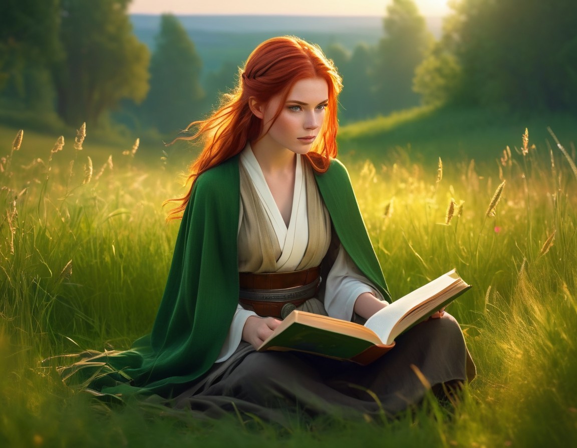Redhead woman in medieval fantasy outfit reading book in sunlit field