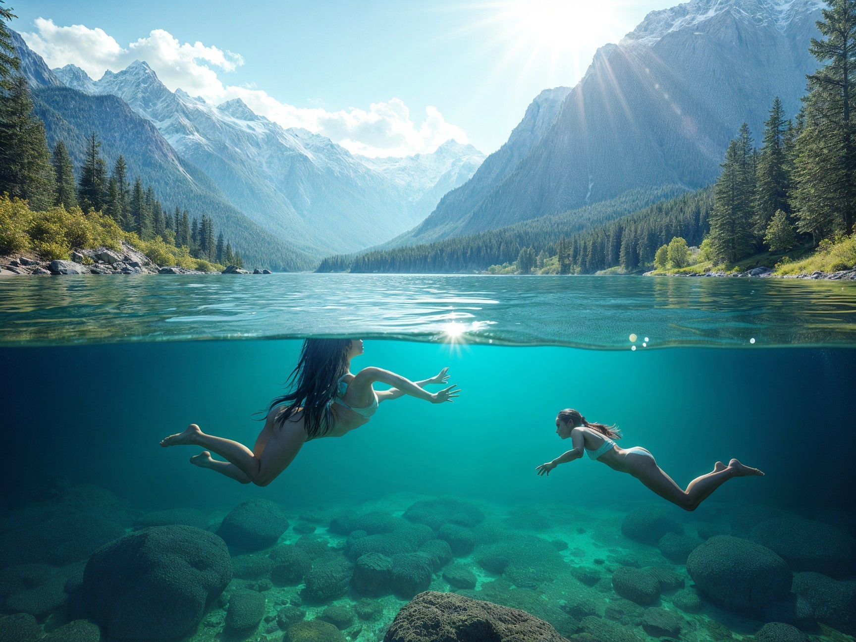 Prompt: Glistening natural lake, crystal clear water, two females diving into the water, both underwater and above water view, mountain backdrop, serene setting, tranquil atmosphere, lush greenery, distant forest, snow-capped peaks, reflections on water, ripples, sunlight dancing on the surface, detailed realism, high definition, vibrant colors, shades of blue, green, and earth tones, natural lighting, picturesque scene, by a skilled landscape artist, Artstation.