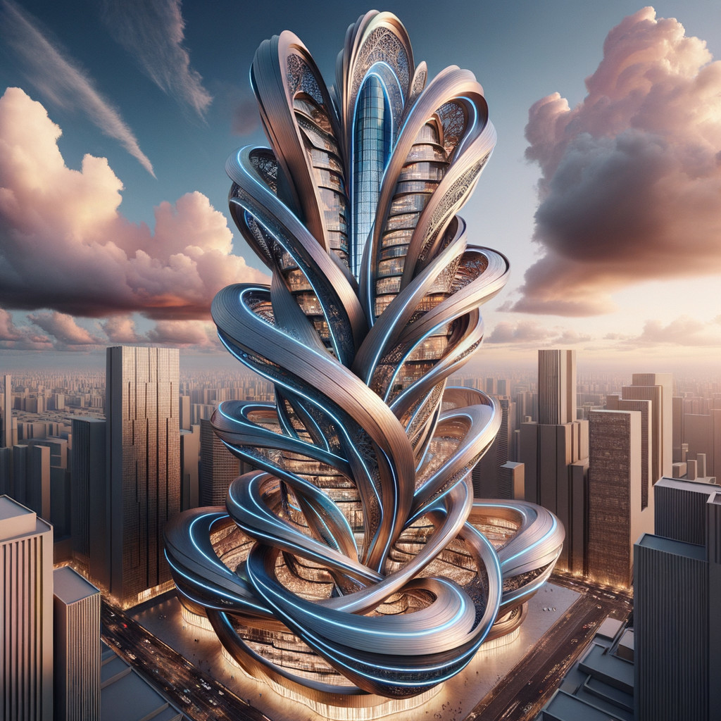 An ultramodern, futuristic building with intertwining, petal-like structures against a cityscape and cloudy sky.