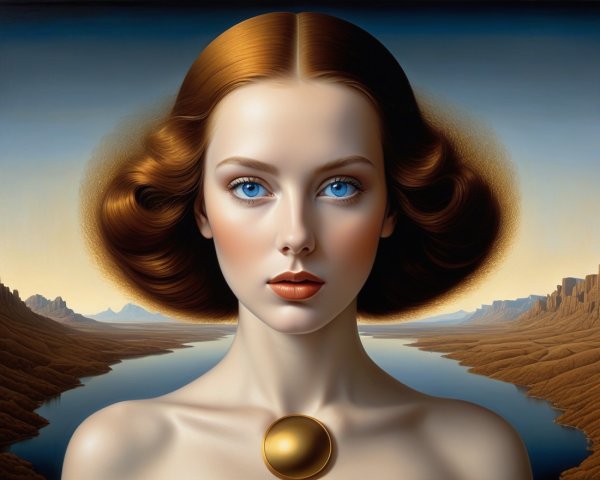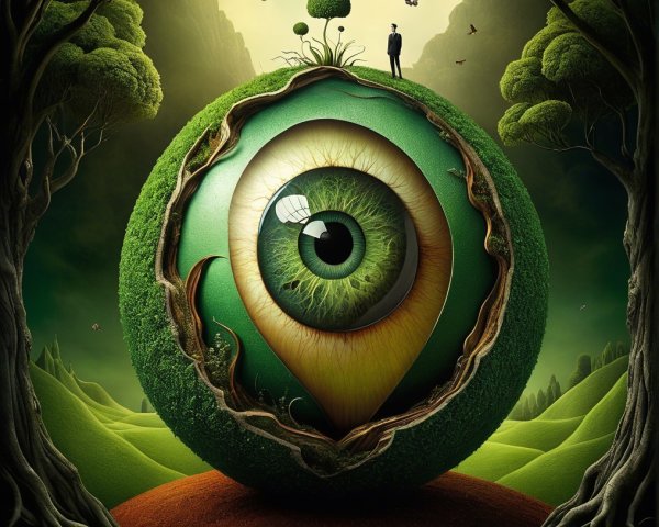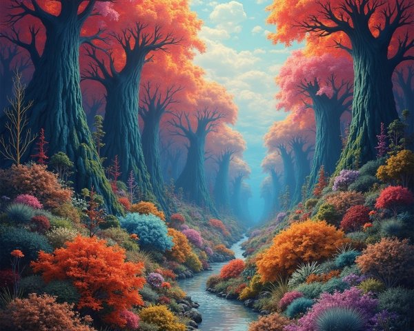 Two abstract humanoid figures, one in red and the other in silver, sit in a surreal landscape of textured trees with orange foliage, surrounded by colorful spheres and a reflective water body.