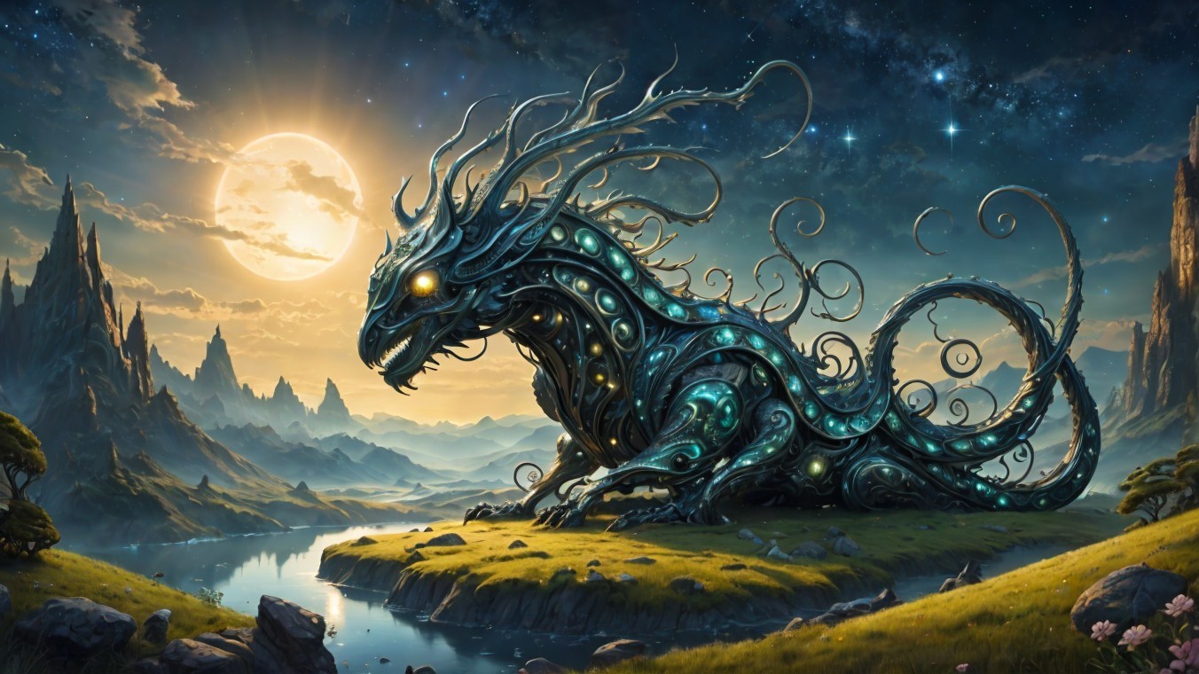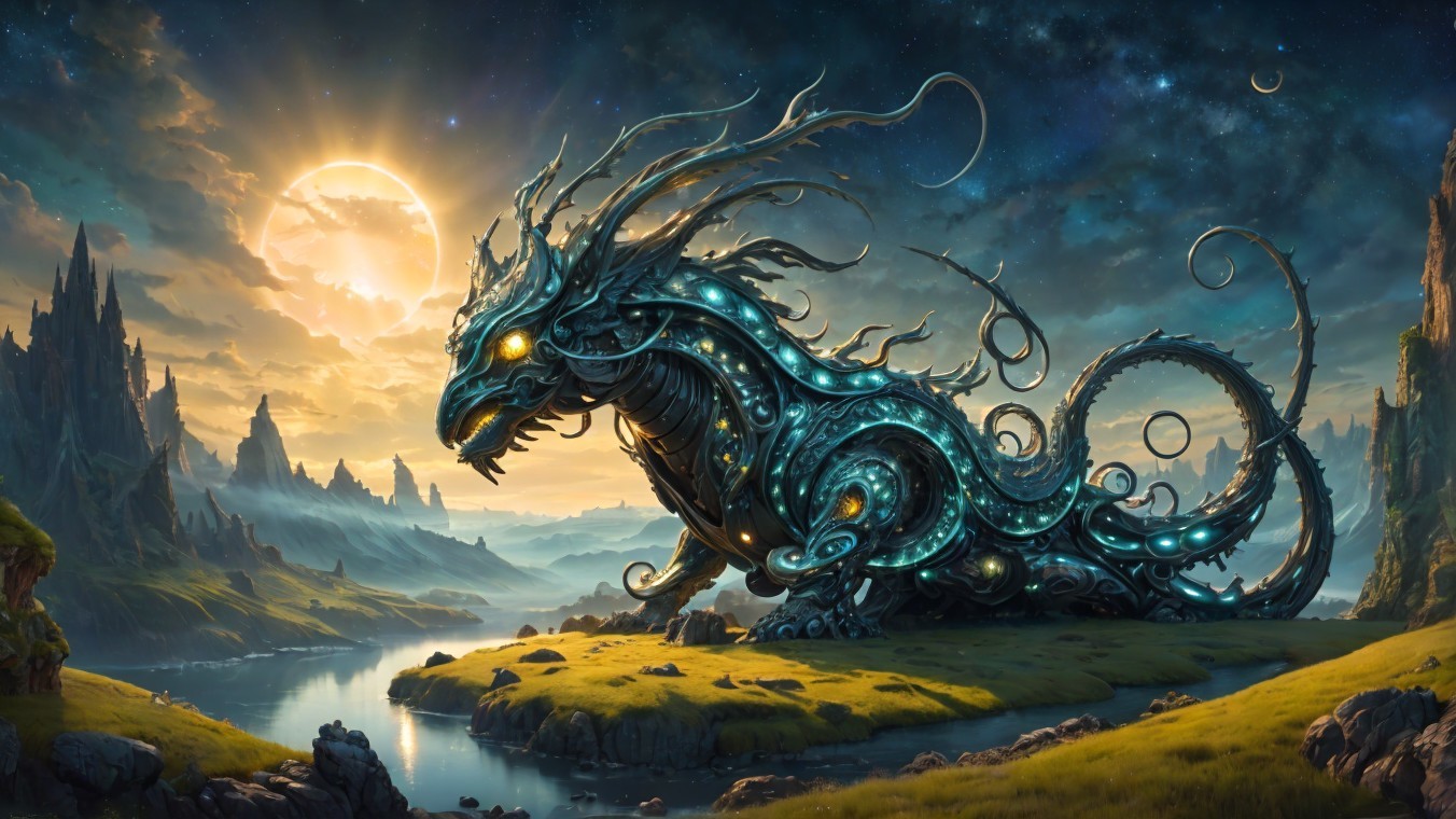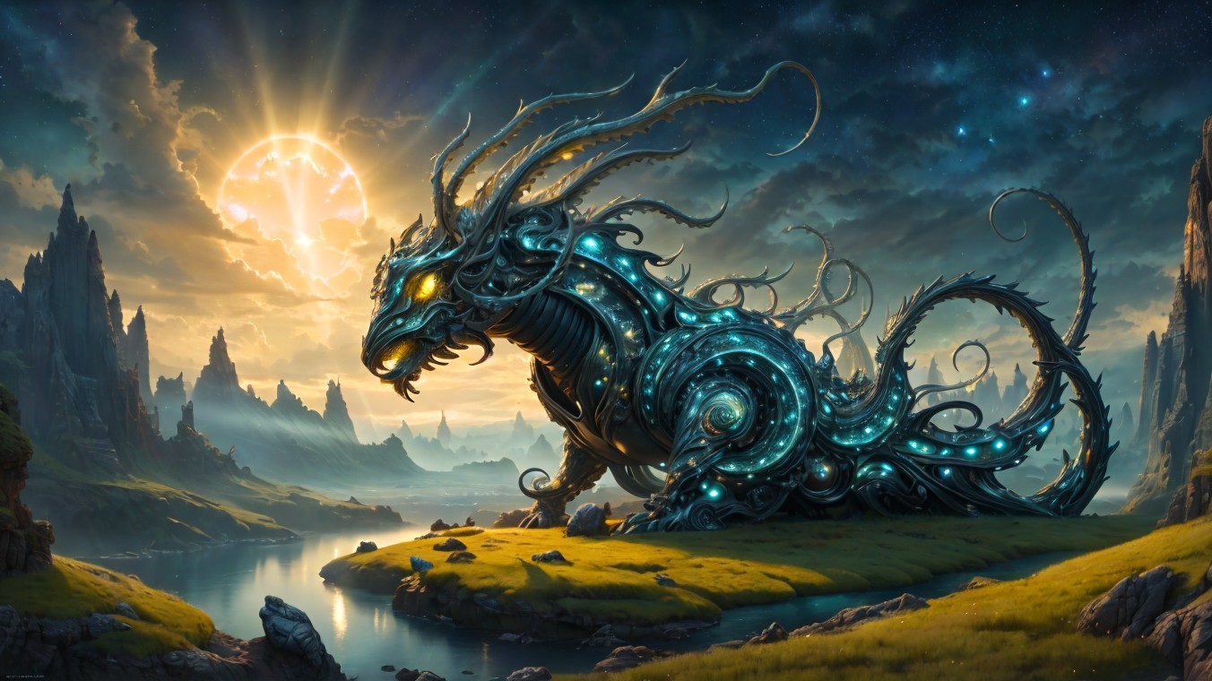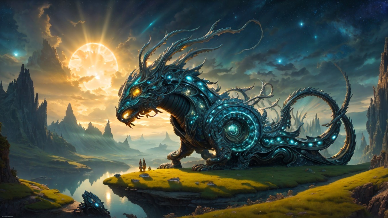 A majestic dragon with glowing blue accents stands on a cliff against a dramatic sky with sunbeams and a comet.