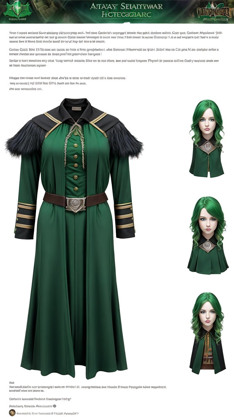 A digital avatar of a woman with green hair in a detailed dark green dress with lace accents. Various dress views are included.