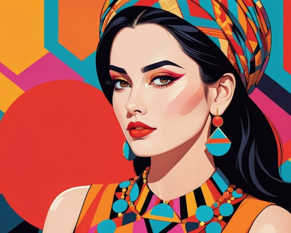 A futuristic warrior stands in a surreal landscape, adorned in metallic armor and a flowing scarf. Vibrant orange hair contrasts with distant planets and floating orbs in the background.