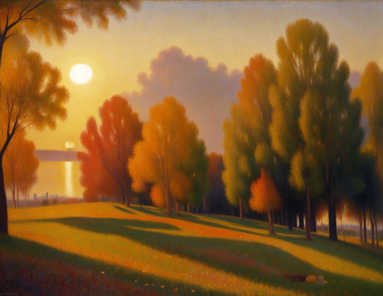 Prompt: Oil on canvas, wide angle landscape view, a wonderful sunrise. Glowing with vibrant hues. Perfect composition. By Georges Seurat . By William Turner.