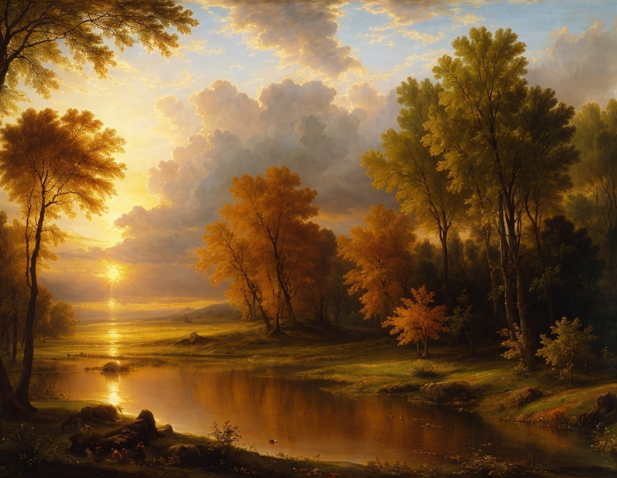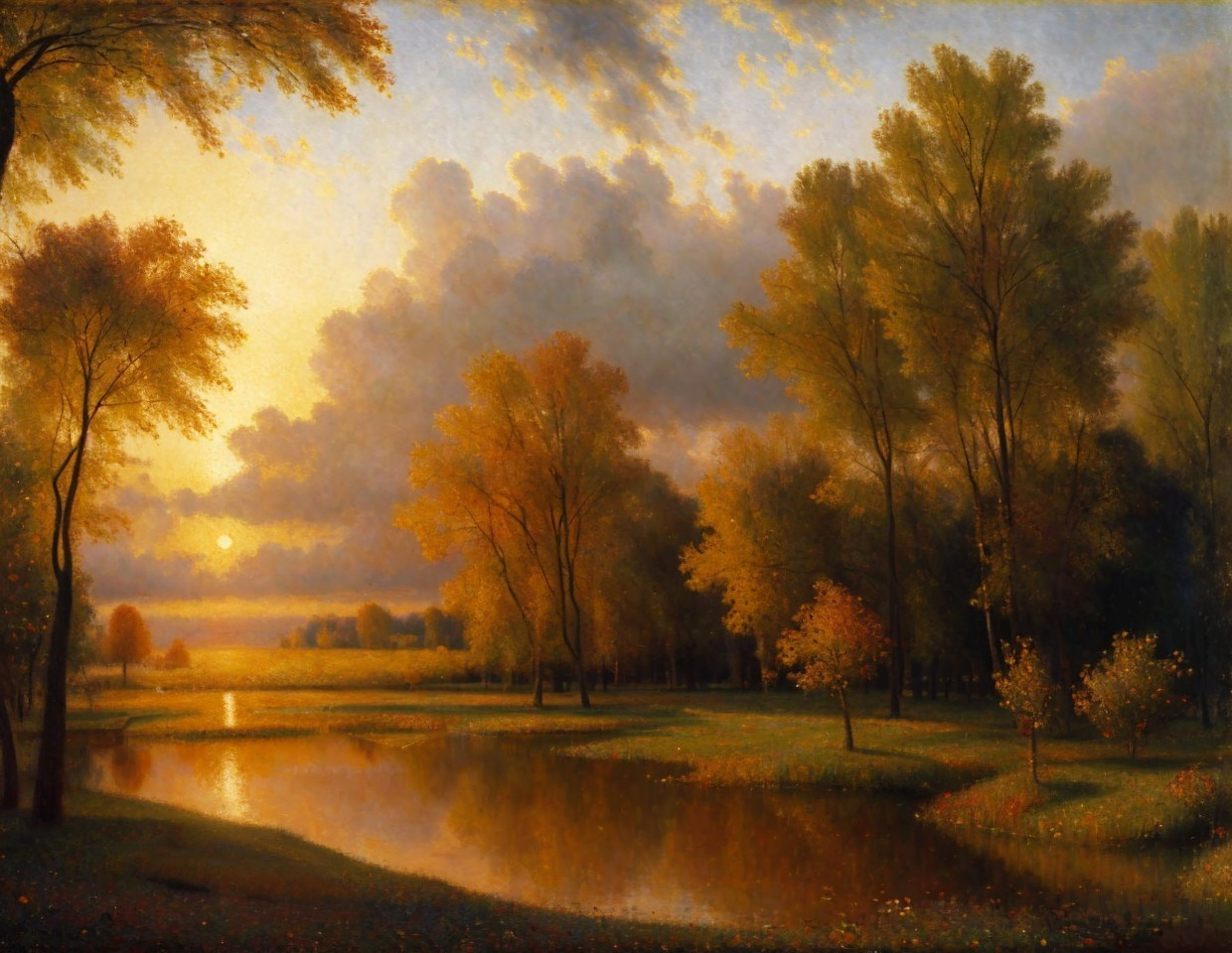Prompt: "Oil on canvas, wide angle landscape view, a wonderful sunrise. Glowing with vibrant hues. Perfect composition. By Peter Paul Rubens. William Turner. By Pierre-Auguste Cot."