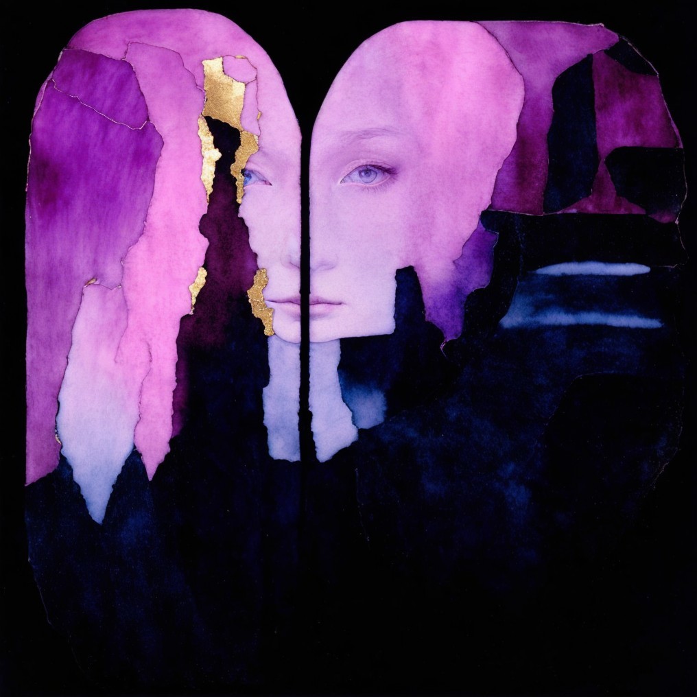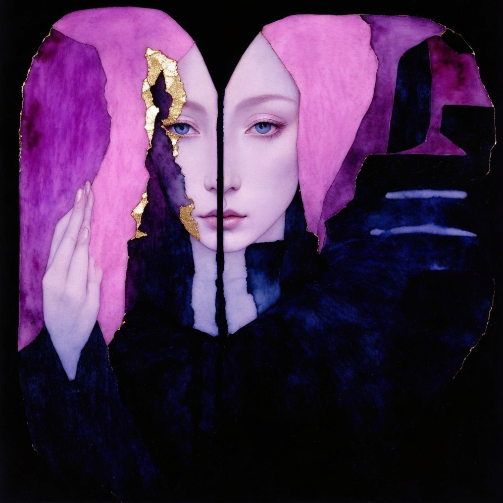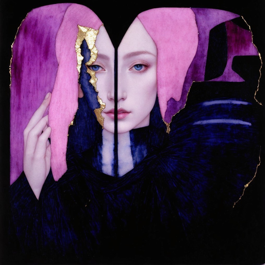 A striking artistic portrayal of a split-faced figure with pink hair, featuring a gold leaf crack. The serene expression contrasts with the bold use of color and intricate details.