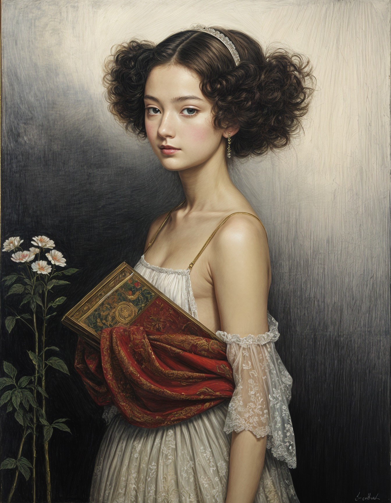 A painting of a woman with unique, halo-like hair reading a book, featuring a serene expression and classical attire.