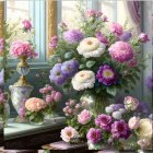 A vibrant still life features bold red poppies in a vase and a colorful painting of the same flowers. Sunlight streams through windows, enhancing the cheerful atmosphere.