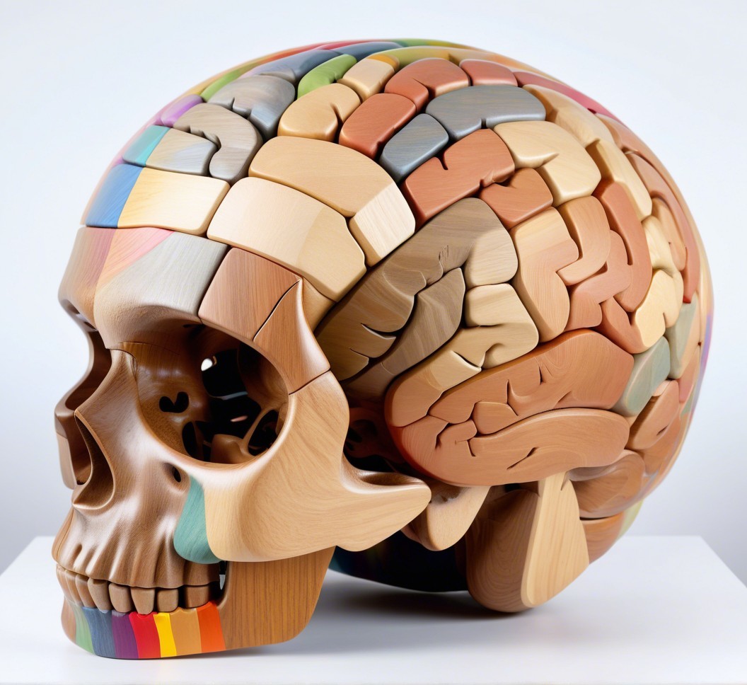 A colorful, layered wooden sculpture depicts a human skull with a detailed, multi-colored brain revealing various sections. The artwork blends anatomical precision with artistic creativity.